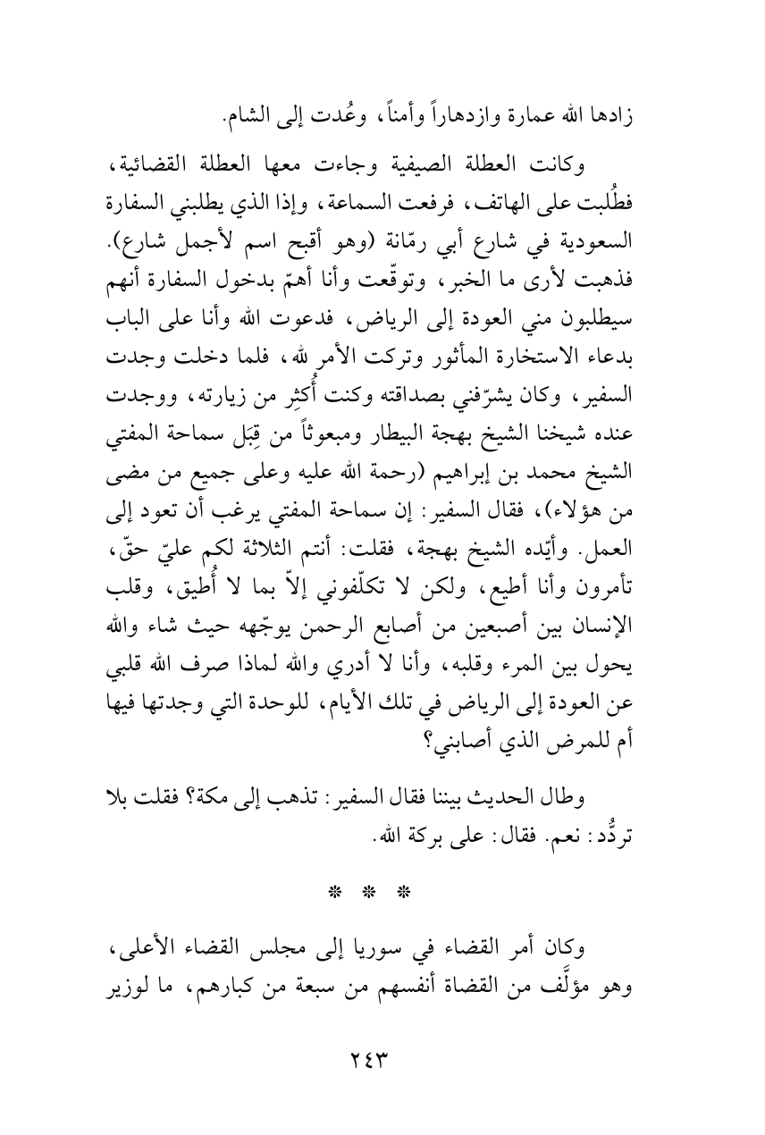 وكانت العطلة الصيفية وجاءت معها العطلة القضائية، فطُلبت على الهاتف، فرفعت السماعة، وإذا الذي يطلبني السفارة السعودية في شارع أبي رمّانة (وهو أقبح اسم لأجمل شارع). فذهبت لأرى ما الخبر، وتوقّعت وأنا أهمّ بدخول السفارة أنهم سيطلبون مني العودة إلى الرياض، فدعوت الله وأنا على الباب بدعاء الاستخارة المأثور وتركت الأمر لله، فلما دخلت وجدت السفير، وكان يشرّفني بصداقته وكنت أُكثِر من زيارته، ووجدت عنده شيخنا الشيخ بهجة البيطار ومبعوثاً من قِبَل سماحة المفتي الشيخ محمد بن إبراهيم (رحمة الله عليه وعلى جميع من مضى من هؤلاء)، فقال السفير: إن سماحة المفتي يرغب أن تعود إلى العمل. وأيّده الشيخ بهجة، فقلت: أنتم الثلاثة لكم عليّ حقّ، تأمرون وأنا أطيع، ولكن لا تكلّفوني إلاّ بما لا أُطيق، وقلب الإنسان بين أصبعين من أصابع الرحمن يوجّهه حيث شاء والله يحول بين المرء وقلبه، وأنا لا أدري والله لماذا صرف الله قلبي عن العودة إلى الرياض في تلك الأيام، للوحدة التي وجدتها فيها أم للمرض الذي أصابني؟