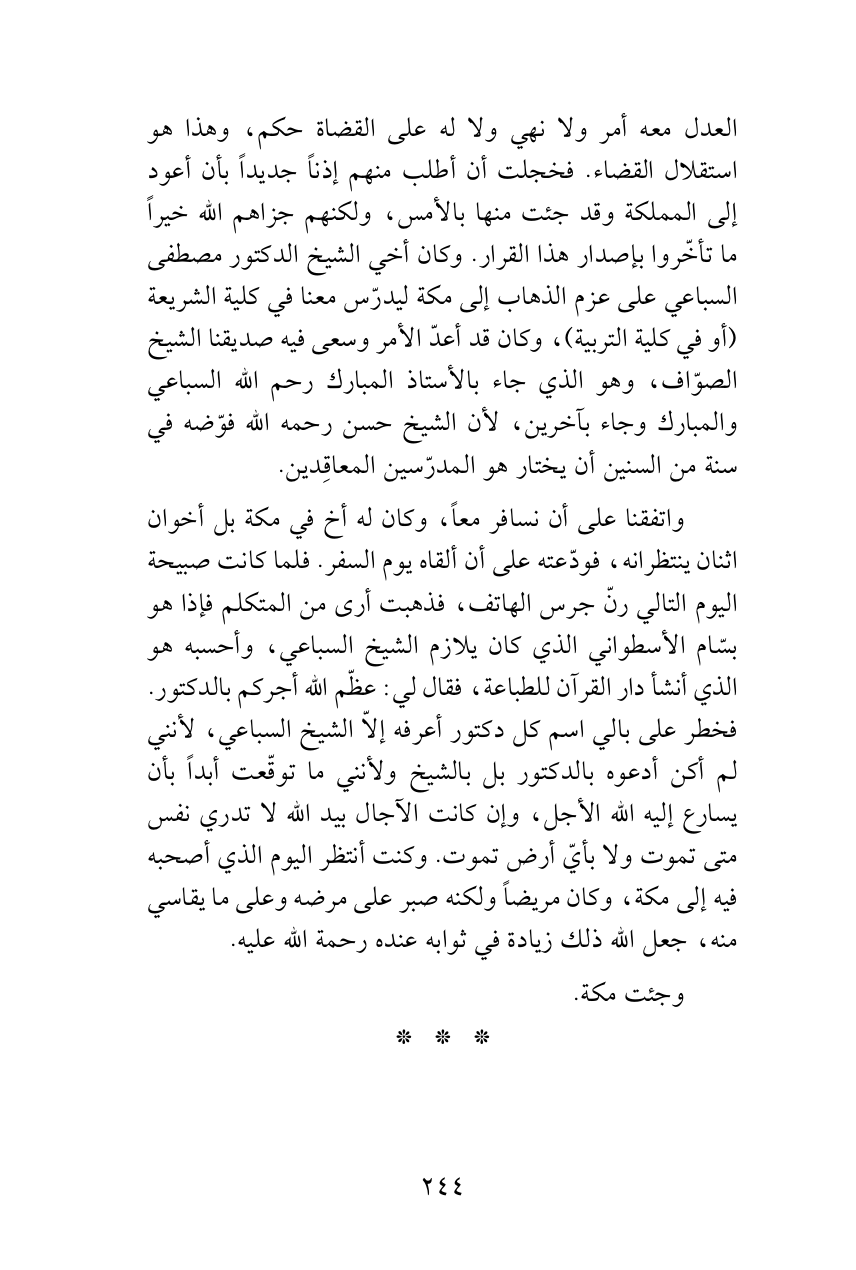 العدل معه أمر ولا نهي ولا له على القضاة حكم، وهذا هو استقلال القضاء. فخجلت أن أطلب منهم إذناً جديداً بأن أعود إلى المملكة وقد جئت منها بالأمس، ولكنهم جزاهم الله خيراً ما تأخّروا بإصدار هذا القرار. وكان أخي الشيخ الدكتور مصطفى السباعي على عزم الذهاب إلى مكة ليدرّس معنا في كلية الشريعة (أو في كلية التربية)، وكان قد أعدّ الأمر وسعى فيه صديقنا الشيخ الصوّاف، وهو الذي جاء بالأستاذ المبارك رحم الله السباعي والمبارك وجاء بآخرين، لأن الشيخ حسن رحمه الله فوّضه في سنة من السنين أن يختار هو المدرّسين المعاقِدين.