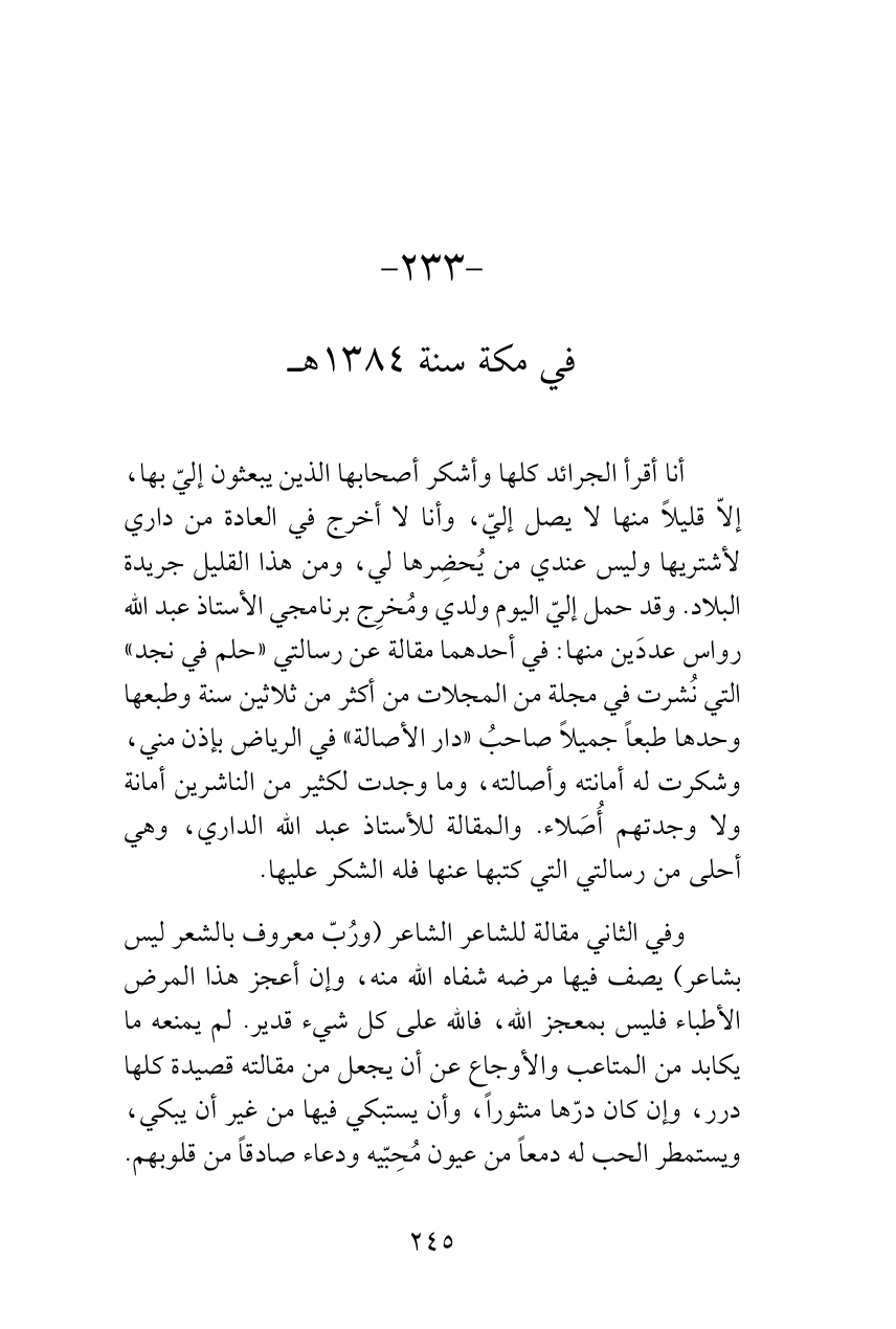 أنا أقرأ الجرائد كلها وأشكر أصحابها الذين يبعثون إليّ بها، إلاّ قليلاً منها لا يصل إليّ، وأنا لا أخرج في العادة من داري لأشتريها وليس عندي من يُحضِرها لي، ومن هذا القليل جريدة البلاد. وقد حمل إليّ اليوم ولدي ومُخرِج برنامجي الأستاذ عبد الله رواس عددَين منها: في أحدهما مقالة عن رسالتي «حلم في نجد» التي نُشرت في مجلة من المجلات من أكثر من ثلاثين سنة وطبعها وحدها طبعاً جميلاً صاحبُ «دار الأصالة» في الرياض بإذن مني، وشكرت له أمانته وأصالته، وما وجدت لكثير من الناشرين أمانة ولا وجدتهم أُصَلاء. والمقالة للأستاذ عبد الله الداري، وهي أحلى من رسالتي التي كتبها عنها فله الشكر عليها.