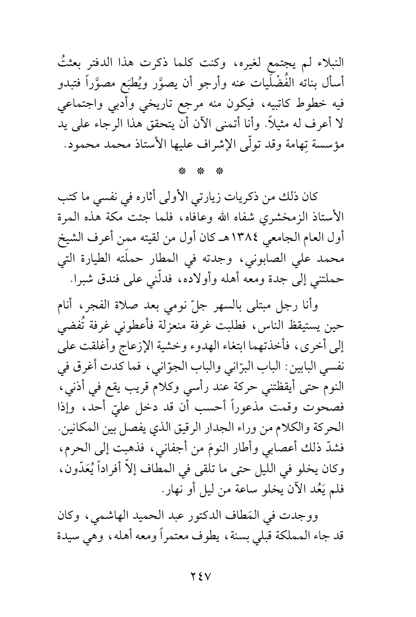 كان ذلك من ذكريات زيارتي الأولى أثاره في نفسي ما كتب الأستاذ الزمخشري شفاه الله وعافاه، فلما جئت مكة هذه المرة أول العام الجامعي 1384هـ كان أول من لقيته ممن أعرف الشيخ محمد علي الصابوني، وجدته في المطار حملَته الطيارة التي حملتني إلى جدة ومعه أهله وأولاده، فدلّني على فندق شبرا.