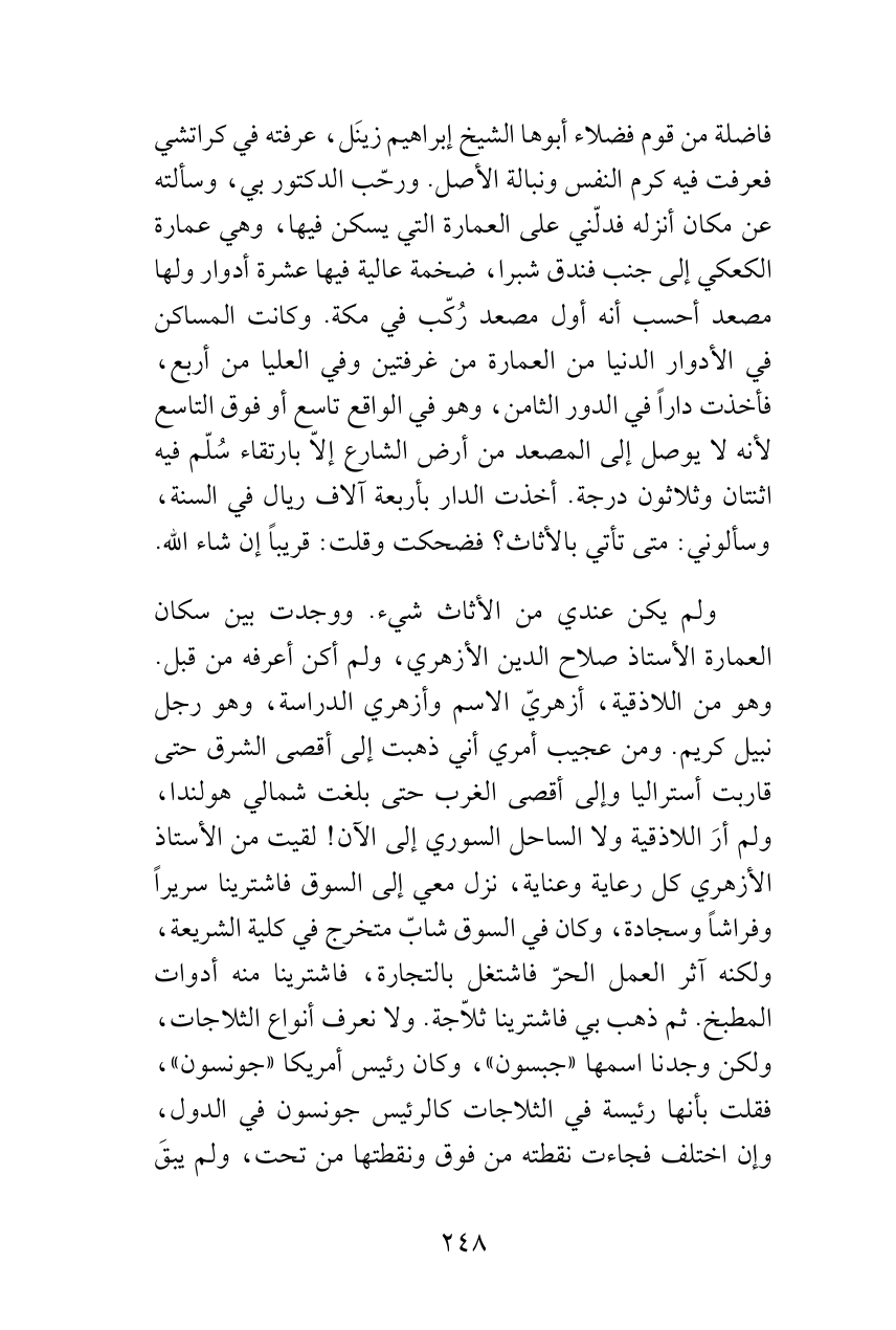 ولم يكن عندي من الأثاث شيء. ووجدت بين سكان العمارة الأستاذ صلاح الدين الأزهري، ولم أكن أعرفه من قبل. وهو من اللاذقية، أزهريّ الاسم وأزهري الدراسة، وهو رجل نبيل كريم. ومن عجيب أمري أني ذهبت إلى أقصى الشرق حتى قاربت أستراليا وإلى أقصى الغرب حتى بلغت شمالي هولندا، ولم أرَ اللاذقية ولا الساحل السوري إلى الآن! لقيت من الأستاذ الأزهري كل رعاية وعناية، نزل معي إلى السوق فاشترينا سريراً وفراشاً وسجادة، وكان في السوق شابّ متخرج في كلية الشريعة، ولكنه آثر العمل الحرّ فاشتغل بالتجارة، فاشترينا منه أدوات المطبخ. ثم ذهب بي فاشترينا ثلاّجة. ولا نعرف أنواع الثلاجات، ولكن وجدنا اسمها «جبسون»، وكان رئيس أمريكا «جونسون»، فقلت بأنها رئيسة في الثلاجات كالرئيس جونسون في الدول، وإن اختلف فجاءت نقطته من فوق ونقطتها من تحت، ولم يبقَ