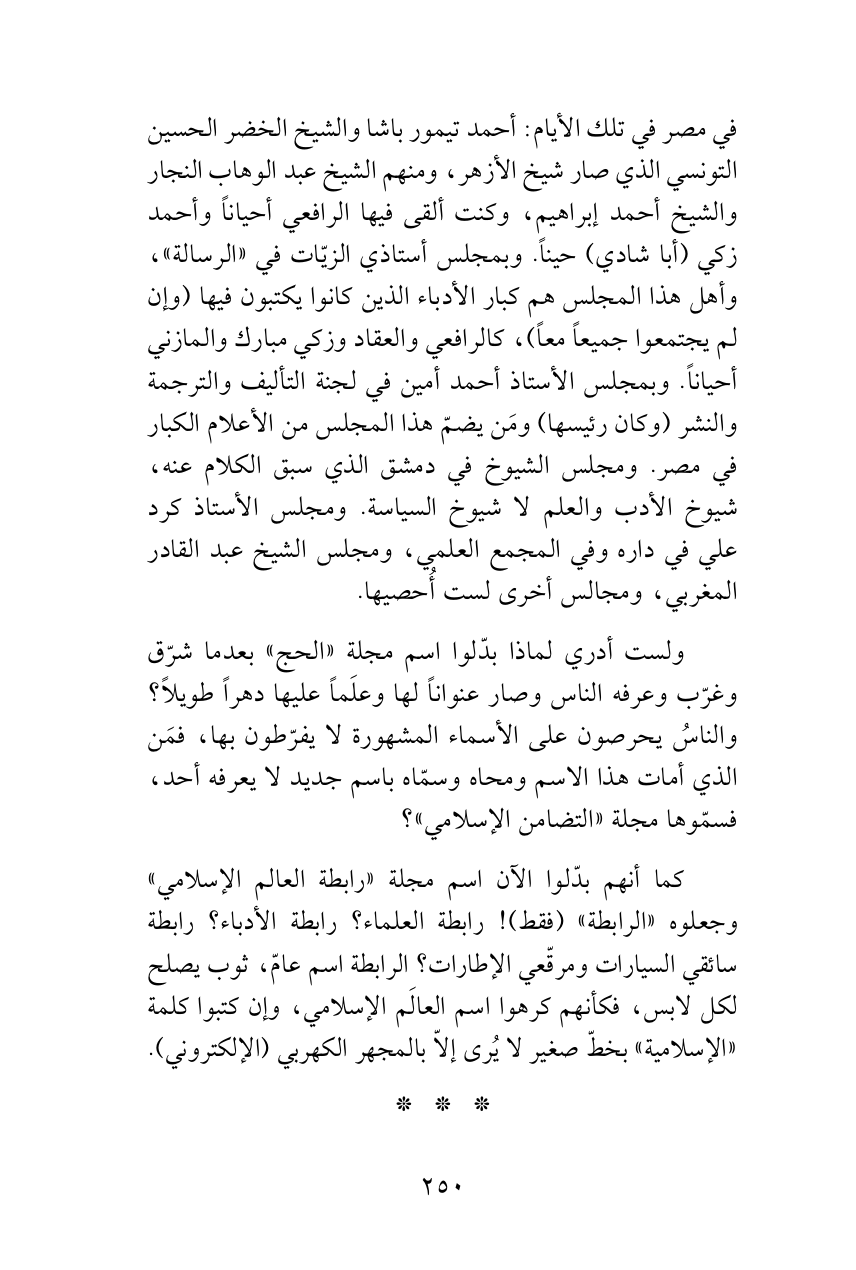 في مصر في تلك الأيام: أحمد تيمور باشا والشيخ الخضر الحسين التونسي الذي صار شيخ الأزهر، ومنهم الشيخ عبد الوهاب النجار والشيخ أحمد إبراهيم، وكنت ألقى فيها الرافعي أحياناً وأحمد زكي (أبا شادي) حيناً. وبمجلس أستاذي الزيّات في «الرسالة»، وأهل هذا المجلس هم كبار الأدباء الذين كانوا يكتبون فيها (وإن لم يجتمعوا جميعاً معاً)، كالرافعي والعقاد وزكي مبارك والمازني أحياناً. وبمجلس الأستاذ أحمد أمين في لجنة التأليف والترجمة والنشر (وكان رئيسها) ومَن يضمّ هذا المجلس من الأعلام الكبار في مصر. ومجلس الشيوخ في دمشق الذي سبق الكلام عنه، شيوخ الأدب والعلم لا شيوخ السياسة. ومجلس الأستاذ كرد علي في داره وفي المجمع العلمي، ومجلس الشيخ عبد القادر المغربي، ومجالس أخرى لست أُحصيها.