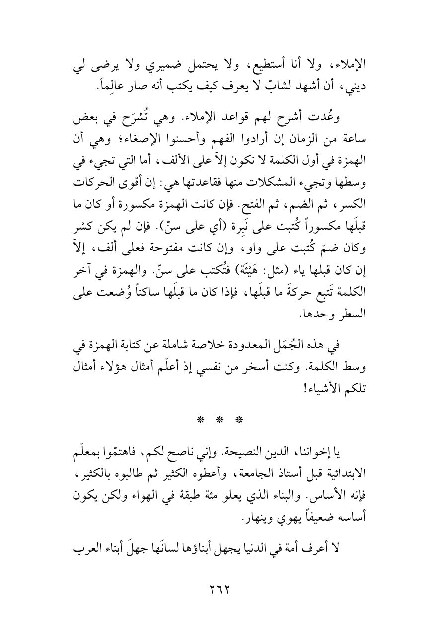 وعُدت أشرح لهم قواعد الإملاء. وهي تُشرَح في بعض ساعة من الزمان إن أرادوا الفهم وأحسنوا الإصغاء؛ وهي أن الهمزة في أول الكلمة لا تكون إلاّ على الألف، أما التي تجيء في وسطها وتجيء المشكلات منها فقاعدتها هي: إن أقوى الحركات الكسر، ثم الضم، ثم الفتح. فإن كانت الهمزة مكسورة أو كان ما قبلَها مكسوراً كُتبت على نَبِرة (أي على سنّ). فإن لم يكن كسْر وكان ضمّ كُتبت على واو، وإن كانت مفتوحة فعلى ألف، إلاّ إن كان قبلها ياء (مثل: هَيْئَة) فتُكتب على سنّ. والهمزة في آخر الكلمة تَتبع حركةَ ما قبلَها، فإذا كان ما قبلَها ساكناً وُضعت على السطر وحدها.