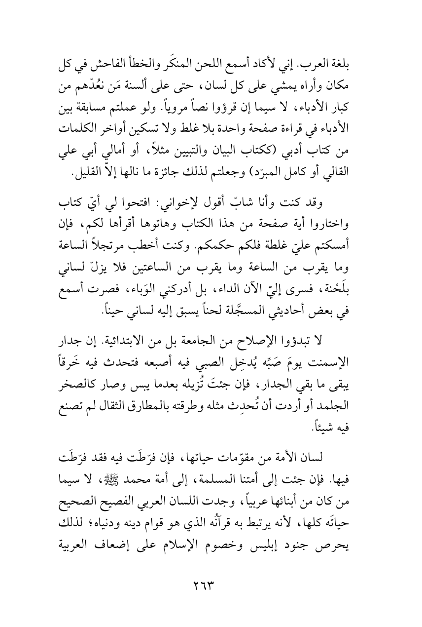 بلغة العرب. إني لأكاد أسمع اللحن المنكَر والخطأ الفاحش في كل مكان وأراه يمشي على كل لسان، حتى على ألسنة مَن نعُدّهم من كبار الأدباء، لا سيما إن قرؤوا نصاً مروياً. ولو عملتم مسابقة بين الأدباء في قراءة صفحة واحدة بلا غلط ولا تسكين أواخر الكلمات من كتاب أدبي (ككتاب البيان والتبيين مثلاً، أو أمالي أبي علي القالي أو كامل المبرّد) وجعلتم لذلك جائزة ما نالها إلاّ القليل.
