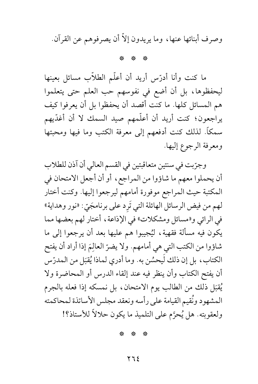وجرّبت في سنتين متعاقبتين في القسم العالي أن آذن للطلاب أن يحملوا معهم ما شاؤوا من المراجع، أو أن أجعل الامتحان في المكتبة حيث المراجع موفورة أمامهم ليرجعوا إليها. وكنت أختار لهم من فيض الرسائل الهائلة التي تَرِد على برنامجَيّ: «نور وهداية» في الرائي و «مسائل ومشكلات» في الإذاعة، أختار لهم بعضها مما يكون فيه مسألة فقهية، ليُجيبوا هم عليها بعد أن يرجعوا إلى ما شاؤوا من الكتب التي هي أمامهم. ولا يضرّ العالِمَ إذا أراد أن يفتح الكتاب، بل إن ذلك لَيحسُن به. وما أدري لماذا يُقبَل من المدرّس أن يفتح الكتاب وأن ينظر فيه عند إلقاء الدرس أو المحاضرة ولا يُقبَل ذلك من الطالب يوم الامتحان، بل نمسكه إذا فعله بالجرم المشهود ونُقيم القيامة على رأسه ونعقد مجلس الأساتذة لمحاكمته ولعقوبته. هل يُحرَّم على التلميذ ما يكون حلالاً للأستاذ؟!