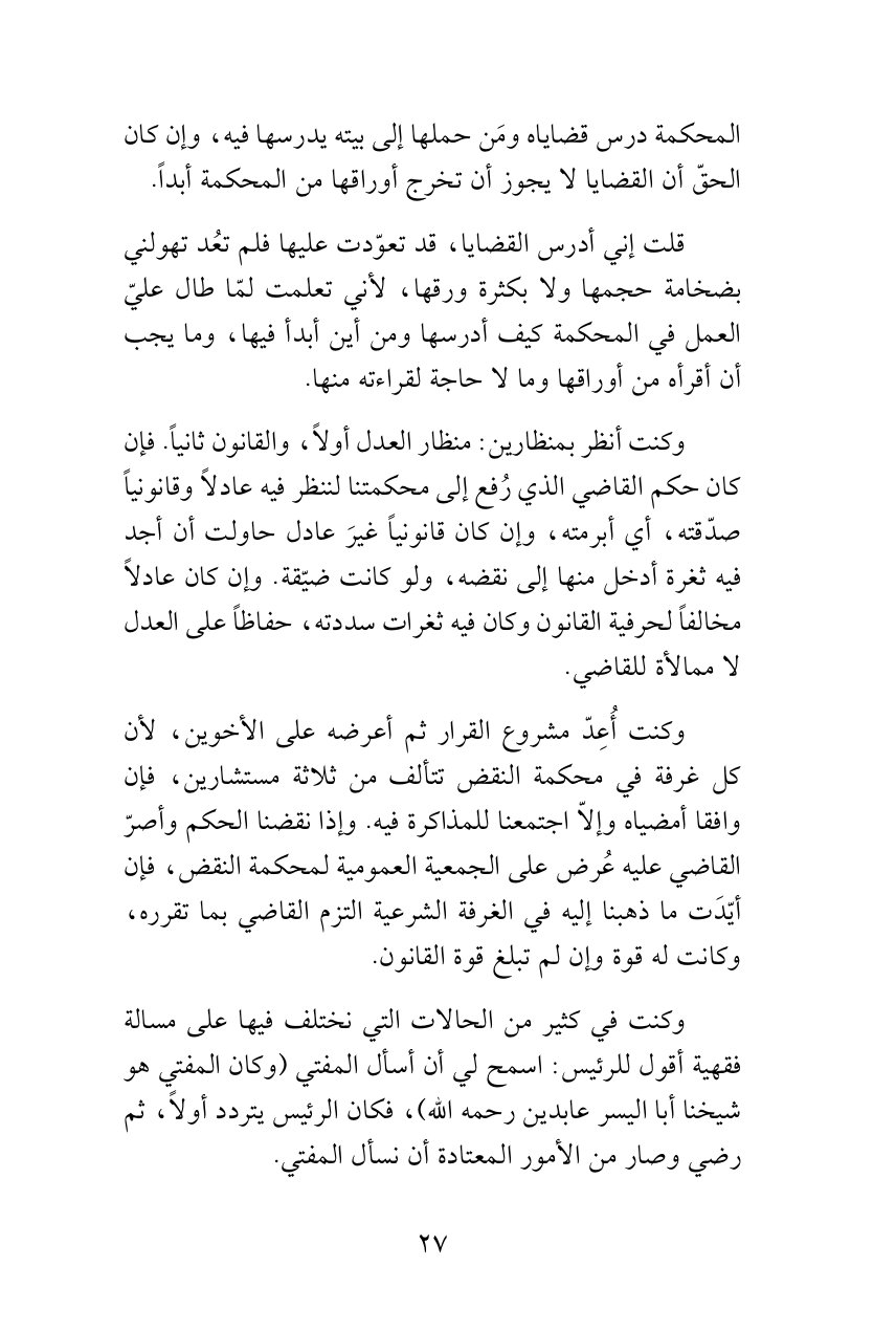 وكنت أُعِدّ مشروع القرار ثم أعرضه على الأخوين، لأن كل غرفة في محكمة النقض تتألف من ثلاثة مستشارين، فإن وافقا أمضياه وإلاّ اجتمعنا للمذاكرة فيه. وإذا نقضنا الحكم وأصرّ القاضي عليه عُرض على الجمعية العمومية لمحكمة النقض، فإن أيّدَت ما ذهبنا إليه في الغرفة الشرعية التزم القاضي بما تقرره، وكانت له قوة وإن لم تبلغ قوة القانون.