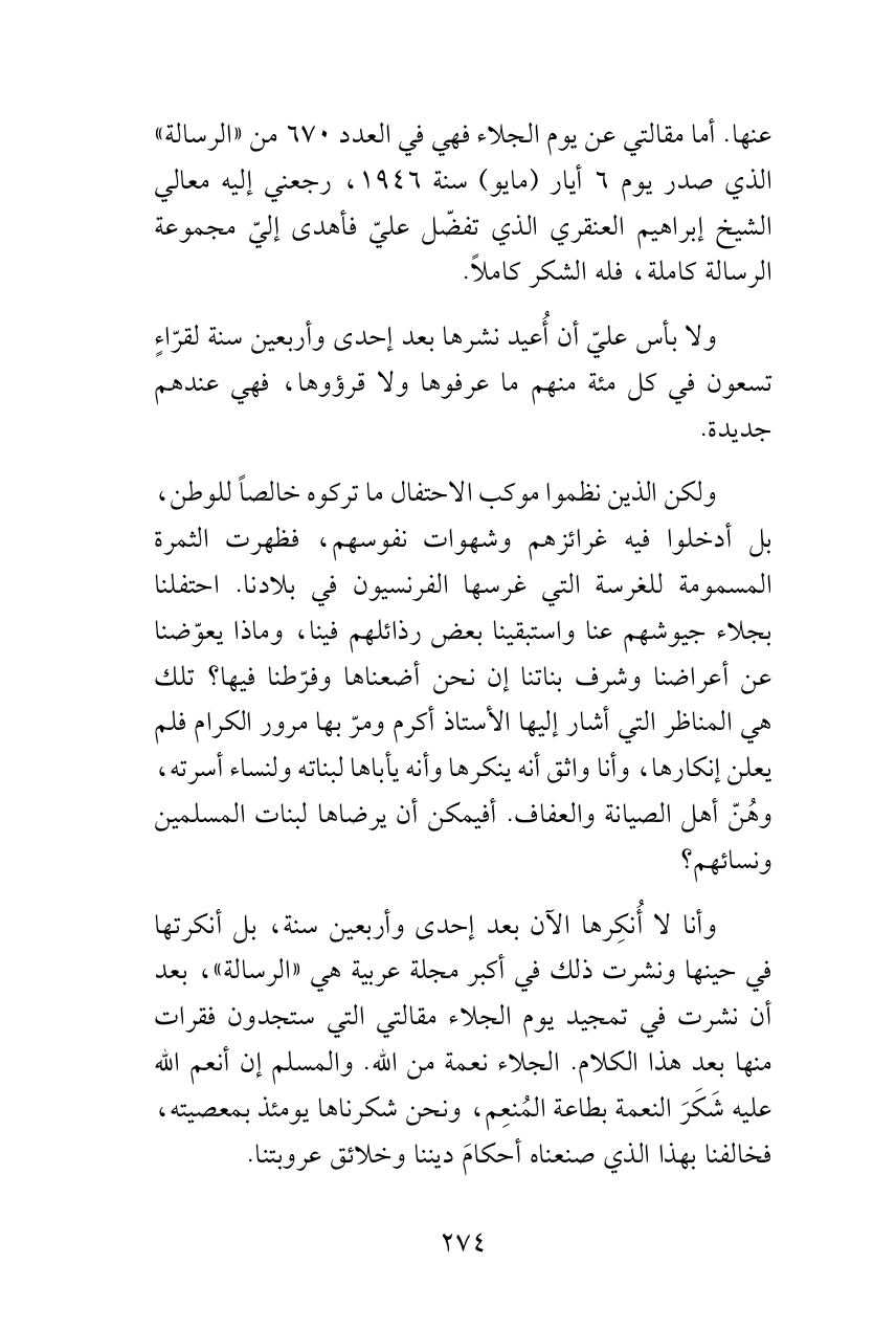 وأنا لا أُنكِرها الآن بعد إحدى وأربعين سنة، بل أنكرتها في حينها ونشرت ذلك في أكبر مجلة عربية هي «الرسالة»، بعد أن نشرت في تمجيد يوم الجلاء مقالتي التي ستجدون فقرات منها بعد هذا الكلام. الجلاء نعمة من الله. والمسلم إن أنعم الله عليه شَكَرَ النعمة بطاعة المُنعِم، ونحن شكرناها يومئذ بمعصيته، فخالفنا بهذا الذي صنعناه أحكامَ ديننا وخلائق عروبتنا.