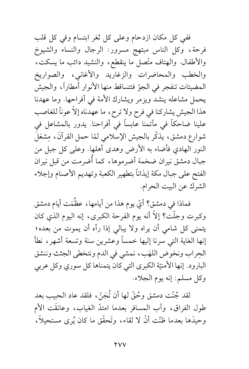 ففي كل مكان ازدحام وعلى كل ثغر ابتسام وفي كل قلب فرحة، وكل الناس مبتهج مسرور: الرجال والنساء والشيوخ والأطفال. والهتاف متّصل ما ينقطع، والنشيد دائب ما يسكت، والخطب والمحاضرات والزغاريد والأغاني، والصواريخ المضيئات تنفجر في الجوّ فتتساقط منها الأنوار أمطاراً، والجيش يحمل مشاعله ينشد ويزمر ويشارك الأمة في أفراحها. وما عهدنا هذا الجيش يشاركنا في فرح ولا ترح، ما عهدناه إلاّ عوناً للغاصب علينا ضاحكاً في مآتمنا عابساً في أفراحنا. يدور بالمشاعل في شوارع دمشق، يذكّر بالجيش الإسلامي لمّا حمل القرآنَ، مِشعَلَ النور الهادي فأضاء به الأرض وهدى أهلها. وعلى كل جبل من جبال دمشق نيران ضخمة أضرموها، كما أُضرمت من قبل نيران الفتح على جبال مكة إيذاناً بتطهير الكعبة وتهديم الأصنام وإجلاء الشرك عن البيت الحرام.