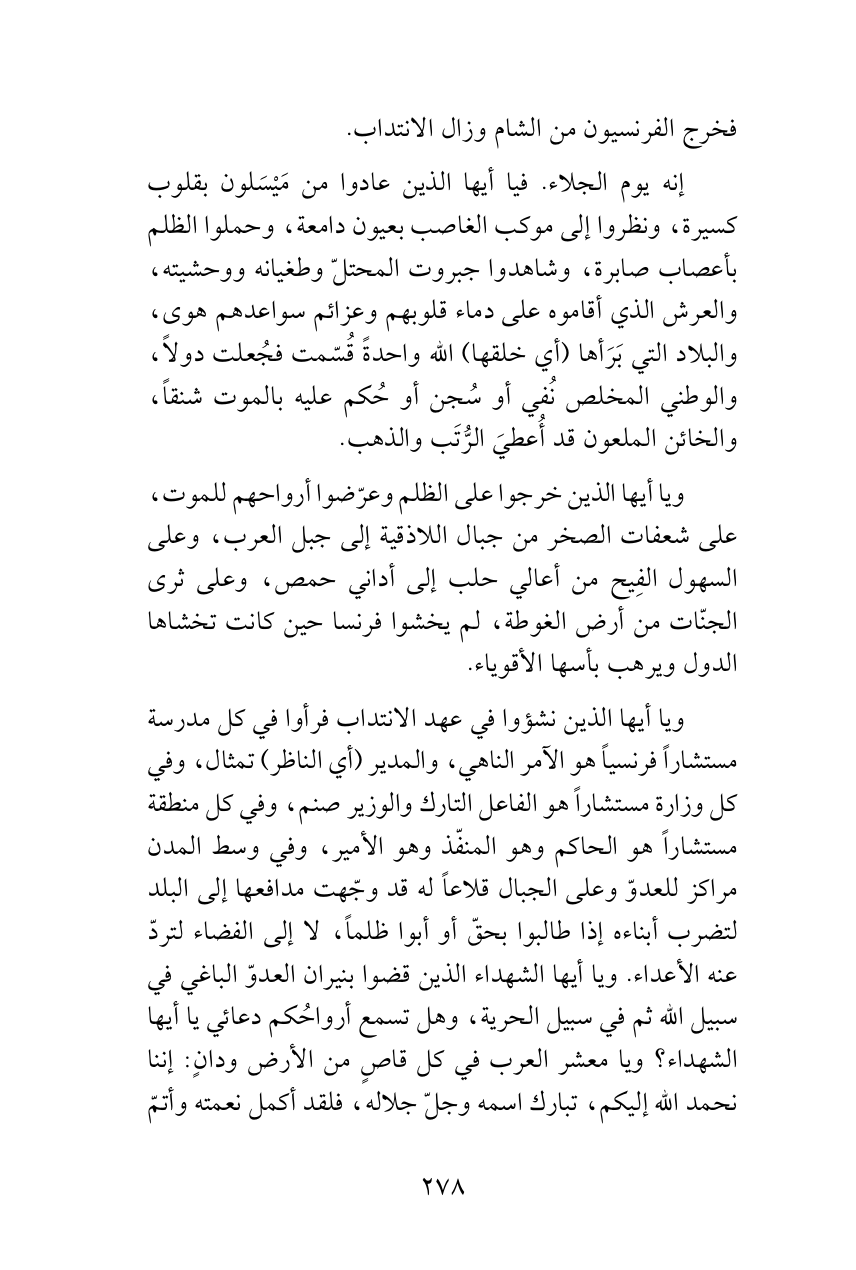 ويا أيها الذين نشؤوا في عهد الانتداب فرأوا في كل مدرسة مستشاراً فرنسياً هو الآمر الناهي، والمدير (أي الناظر) تمثال، وفي كل وزارة مستشاراً هو الفاعل التارك والوزير صنم، وفي كل منطقة مستشاراً هو الحاكم وهو المنفّذ وهو الأمير، وفي وسط المدن مراكز للعدوّ وعلى الجبال قلاعاً له قد وجّهت مدافعها إلى البلد لتضرب أبناءه إذا طالبوا بحقّ أو أبوا ظلماً، لا إلى الفضاء لتردّ عنه الأعداء. ويا أيها الشهداء الذين قضوا بنيران العدوّ الباغي في سبيل الله ثم في سبيل الحرية، وهل تسمع أرواحُكم دعائي ياأيها الشهداء؟ ويا معشر العرب في كل قاصٍ من الأرض ودانٍ: إننا نحمد الله إليكم، تبارك اسمه وجلّ جلاله، فلقد أكمل نعمته وأتمّ