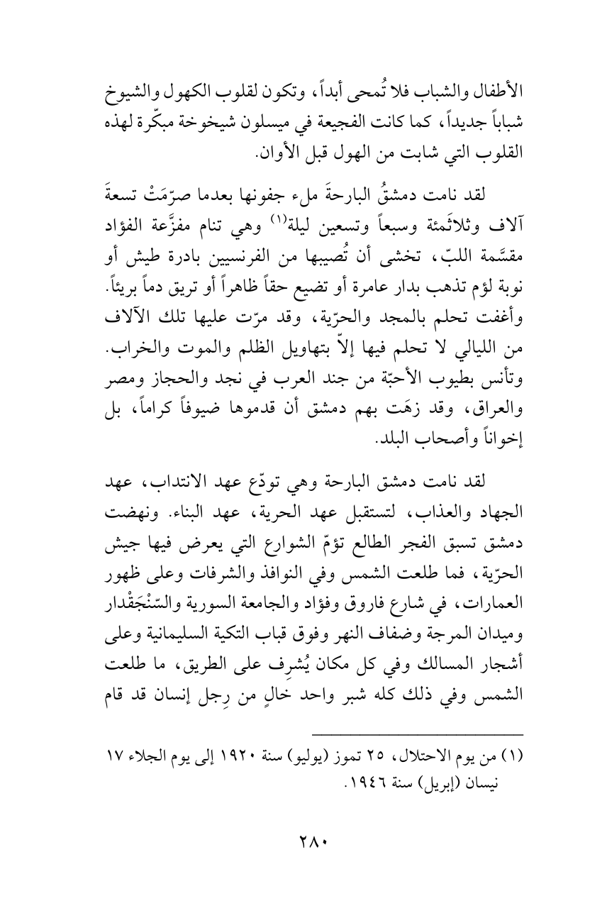 لقد نامت دمشق البارحة وهي تودّع عهد الانتداب، عهد الجهاد والعذاب، لتستقبل عهد الحرية، عهد البناء. ونهضت دمشق تسبق الفجر الطالع تؤمّ الشوارع التي يعرض فيها جيش الحرّية، فما طلعت الشمس وفي النوافذ والشرفات وعلى ظهور العمارات، في شارع فاروق وفؤاد والجامعة السورية والسّنْجَقْدار وميدان المرجة وضفاف النهر وفوق قباب التكية السليمانية وعلى أشجار المسالك وفي كل مكان يُشرِف على الطريق، ما طلعت الشمس وفي ذلك كله شبر واحد خالٍ من رِجل إنسان قد قام