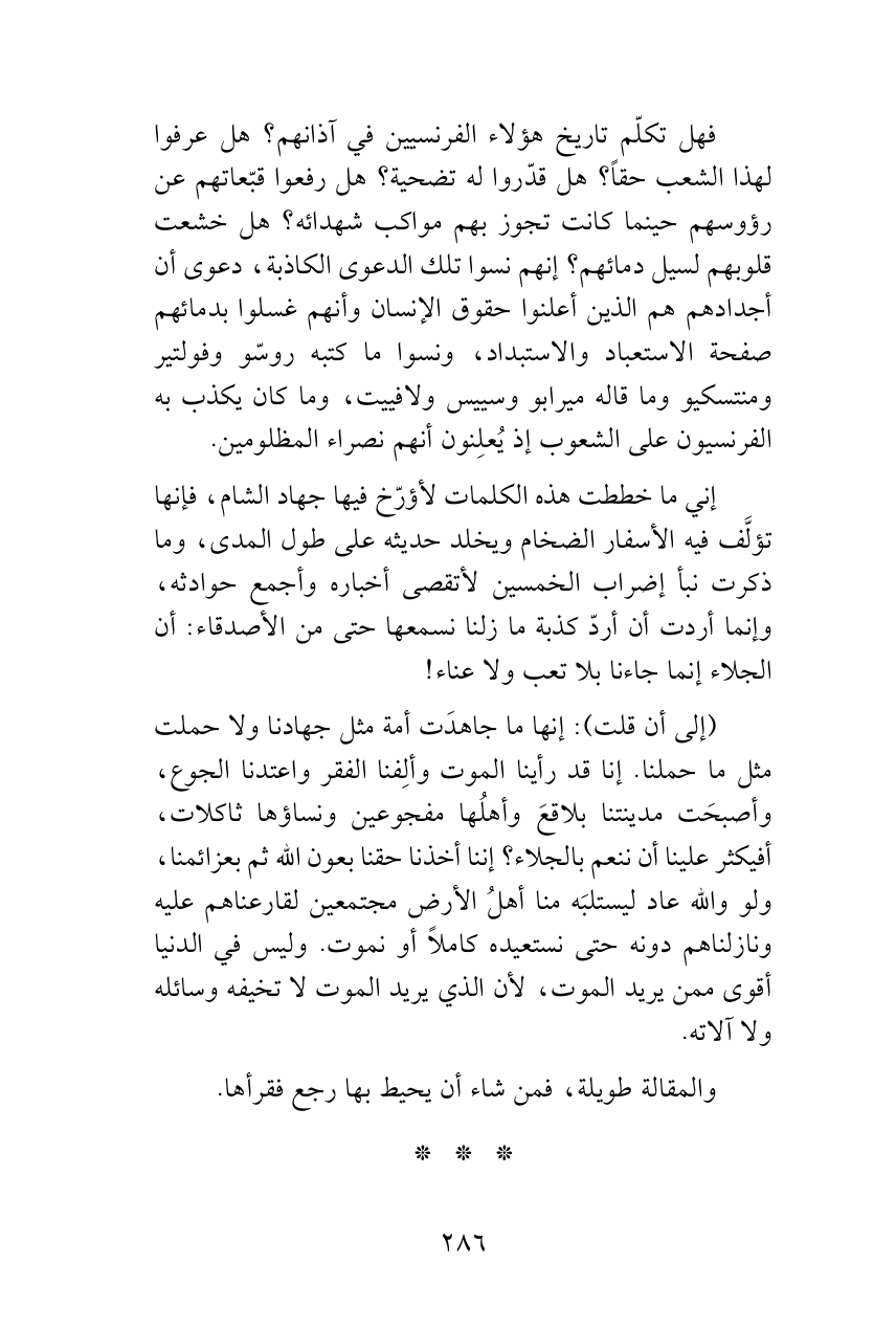 فهل تكلّم تاريخ هؤلاء الفرنسيين في آذانهم؟ هل عرفوا لهذا الشعب حقاً؟ هل قدّروا له تضحية؟ هل رفعوا قبّعاتهم عن رؤوسهم حينما كانت تجوز بهم مواكب شهدائه؟ هل خشعت قلوبهم لسيل دمائهم؟ إنهم نسوا تلك الدعوى الكاذبة، دعوى أن أجدادهم هم الذين أعلنوا حقوق الإنسان وأنهم غسلوا بدمائهم صفحة الاستعباد والاستبداد، ونسوا ما كتبه روسّو وفولتير ومنتسكيو وما قاله ميرابو وسييس ولافييت، وما كان يكذب به الفرنسيون على الشعوب إذ يُعلِنون أنهم نصراء المظلومين.