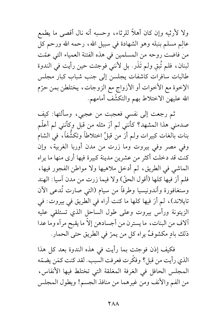ولا لأرثيه وإن كان أهلاً للرثاء، وحسبه أنه نال أقصى ما يطمع عالِم مسلم بنبله وهو الشهادة في سبيل الله، رحمه الله ورحم كل من فاضت روحه من المسلمين في هذه الفتنة العمياء التي عمّت لبنان، فلم تُبقِ ولم تَذَر. بل لأنني فوجئت حين رأيت في الندوة طالبات سافرات كاشفات يجلسن إلى جنب شباب كبار مجلس الإخوة مع الأخوات أو الأزواج مع الزوجات، يختلطن بمن حرّم الله عليهن الاختلاط بهم والتكشّف أمامهم.
