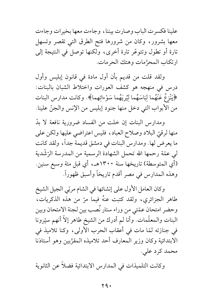 ومدارس البنات إن خلت من الفساد ضرورية نافعة لا بدّ منها لرقيّ البلاد وصلاح العباد، فليس اعتراضي عليها ولكن على ما يعرض لها. ومدارس البنات في دمشق قديمة جداً، ولقد كانت لي عمّة رحمها الله تحمل الشهادة الرسمية من المدرسة الرّشْدية (أي المتوسطة) تاريخها سنة 1300هـ، أي قبل مئة وسبع سنين. وهذه المدارس في مصر أقدم تاريخاً وأسبق ظهوراً.