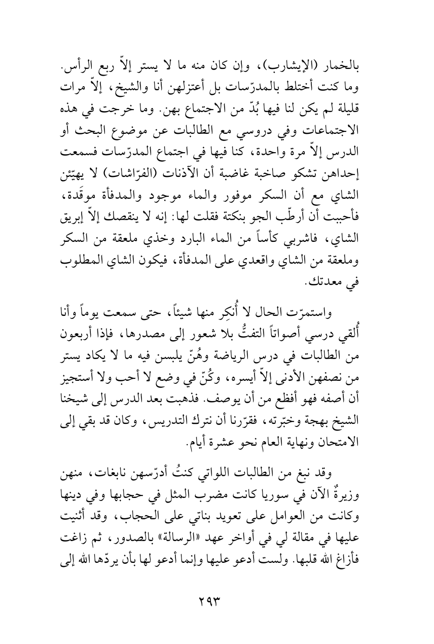 بالخمار (الإيشارب)، وإن كان منه ما لا يستر إلاّ ربع الرأس. وما كنت أختلط بالمدرّسات بل أعتزلهن أنا والشيخ، إلاّ مرات قليلة لم يكن لنا فيها بُدّ من الاجتماع بهن. وما خرجت في هذه الاجتماعات وفي دروسي مع الطالبات عن موضوع البحث أو الدرس إلاّ مرة واحدة، كنا فيها في اجتماع المدرّسات فسمعت إحداهن تشكو صاخبة غاضبة أن الآذنات (الفرّاشات) لا يهيّئن الشاي مع أن السكر موفور والماء موجود والمدفأة موقَدة، فأحببت أن أرطّب الجو بنكتة فقلت لها: إنه لا ينقصك إلاّ إبريق الشاي، فاشربي كأساً من الماء البارد وخذي ملعقة من السكر وملعقة من الشاي واقعدي على المدفأة، فيكون الشاي المطلوب في معدتك.