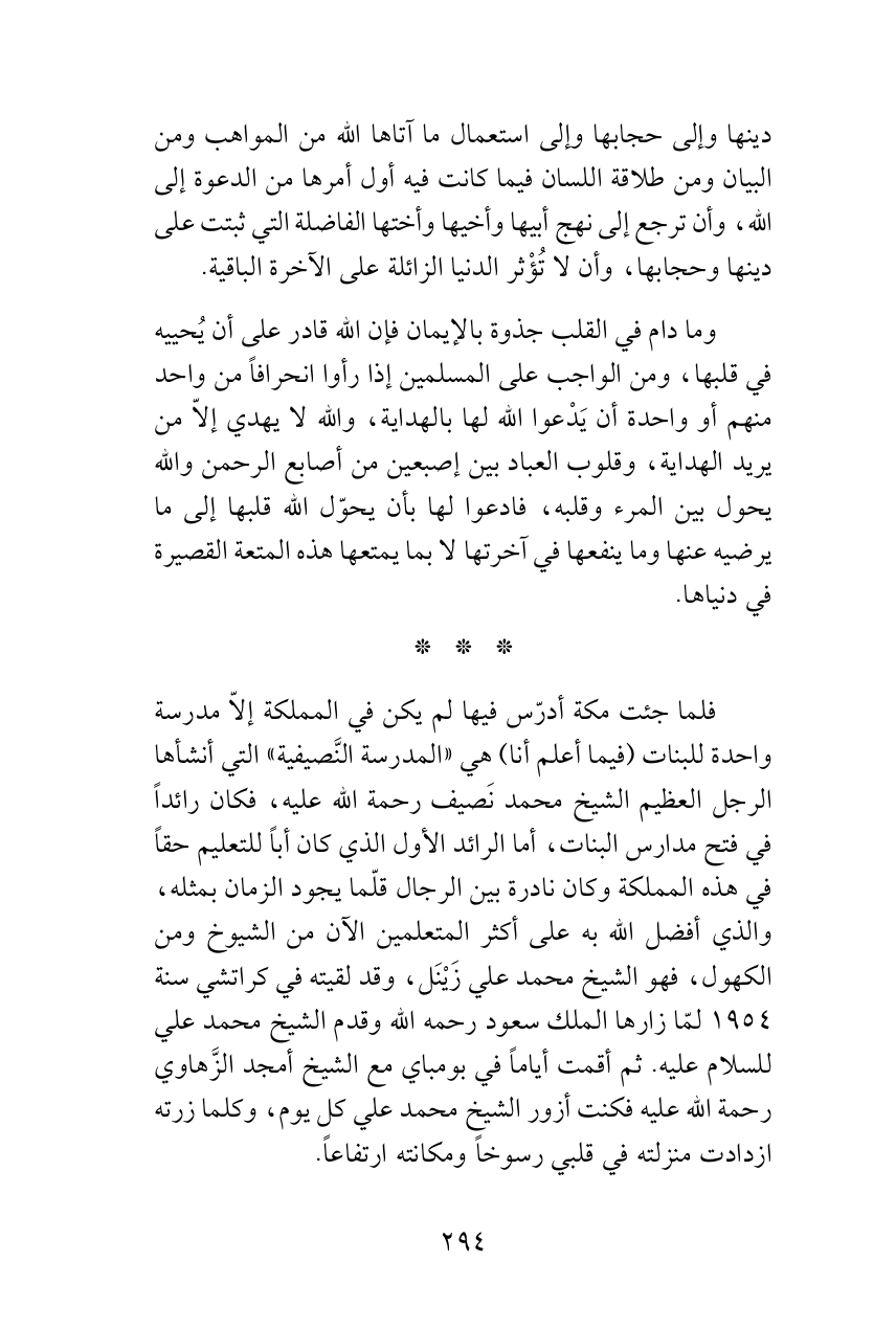 فلما جئت مكة أدرّس فيها لم يكن في المملكة إلاّ مدرسة واحدة للبنات (فيما أعلم أنا) هي «المدرسة النَّصيفية» التي أنشأها الرجل العظيم الشيخ محمد نَصيف رحمة الله عليه، فكان رائداً في فتح مدارس البنات، أما الرائد الأول الذي كان أباً للتعليم حقاً في هذه المملكة وكان نادرة بين الرجال قلّما يجود الزمان بمثله، والذي أفضل الله به على أكثر المتعلمين الآن من الشيوخ ومن الكهول، فهو الشيخ محمد علي زَيْنَل، وقد لقيته في كراتشي سنة 1954 لمّا زارها الملك سعود رحمه الله وقدم الشيخ محمد علي للسلام عليه. ثم أقمت أياماً في بومباي مع الشيخ أمجد الزَّهاوي رحمة الله عليه فكنت أزور الشيخ محمد علي كل يوم، وكلما زرته ازدادت منزلته في قلبي رسوخاً ومكانته ارتفاعاً.