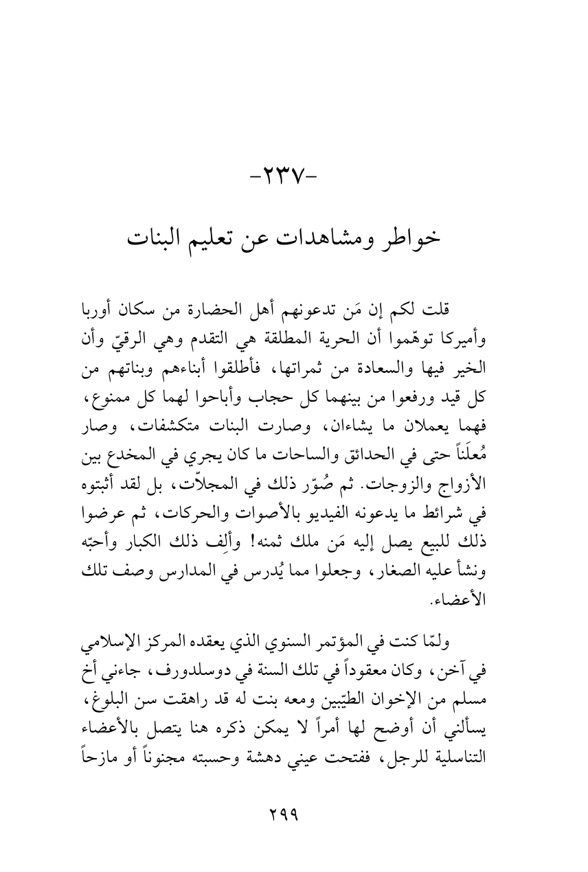 ولمّا كنت في المؤتمر السنوي الذي يعقده المركز الإسلامي في آخن، وكان معقوداً في تلك السنة في دوسلدورف، جاءني أخ مسلم من الإخوان الطيّبين ومعه بنت له قد راهقت سن البلوغ، يسألني أن أوضح لها أمراً لا يمكن ذكره هنا يتصل بالأعضاء التناسلية للرجل، ففتحت عيني دهشة وحسبته مجنوناً أو مازحاً