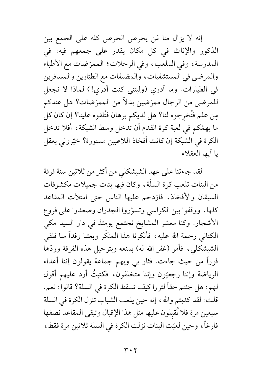 إنه لا يزال منا مَن يحرص الحرص كله على الجمع بين الذكور والإناث في كل مكان يقدر على جمعهم فيه: في المدرسة، وفي الملعب، وفي الرحلات؛ الممرّضات مع الأطباء والمرضى في المستشفيات، والمضيفات مع الطيّارين والمسافرين في الطيارات. وما أدري (وليتني كنت أدري!) لماذا لا نجعل للمرضى من الرجال ممرّضين بدلاً من الممرّضات؟ هل عندكم مِن علم فتُخرِجوه لنا؟ هل لديكم برهان فتُلقوه علينا؟ إن كان كل ما يهمّكم في لعبة كرة القدم أن تدخل وسط الشبكة، أفلا تدخل الكرة في الشبكة إن كانت أفخاذ اللاعبين مستورة؟ خبّروني بعقل ياأيها العقلاء.