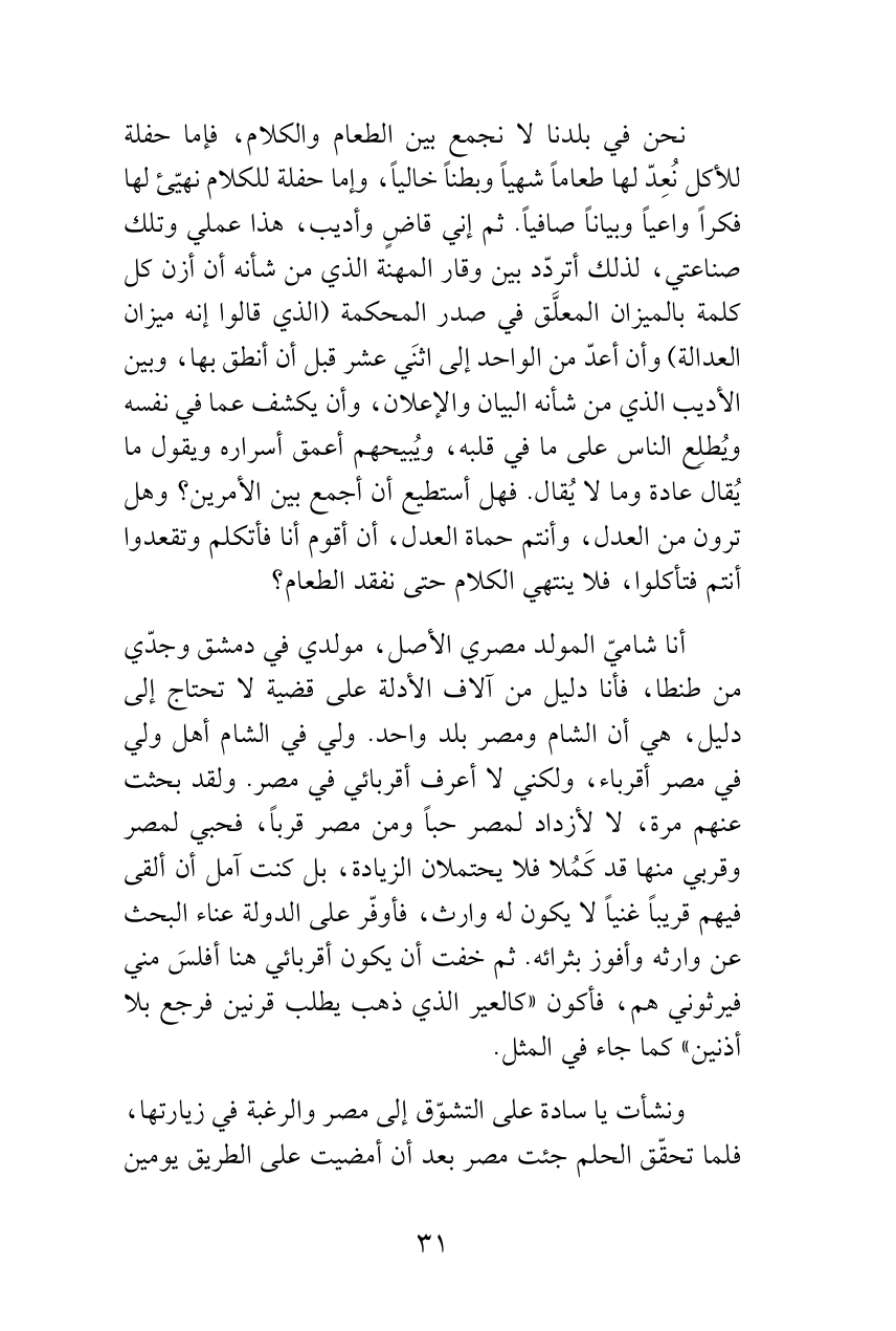 نحن في بلدنا لا نجمع بين الطعام والكلام، فإما حفلة للأكل نُعِدّ لها طعاماً شهياً وبطناً خالياً، وإما حفلة للكلام نهيّئ لها فكراً واعياً وبياناً صافياً. ثم إني قاضٍ وأديب، هذا عملي وتلك صناعتي، لذلك أتردّد بين وقار المهنة الذي من شأنه أن أزن كل كلمة بالميزان المعلَّق في صدر المحكمة (الذي قالوا إنه ميزان العدالة) وأن أعدّ من الواحد إلى اثنَي عشر قبل أن أنطق بها، وبين الأديب الذي من شأنه البيان والإعلان، وأن يكشف عما في نفسه ويُطلِع الناس على ما في قلبه، ويُبيحهم أعمق أسراره ويقول ما يُقال عادة وما لا يُقال. فهل أستطيع أن أجمع بين الأمرين؟ وهل ترون من العدل، وأنتم حماة العدل، أن أقوم أنا فأتكلم وتقعدوا أنتم فتأكلوا، فلا ينتهي الكلام حتى نفقد الطعام؟