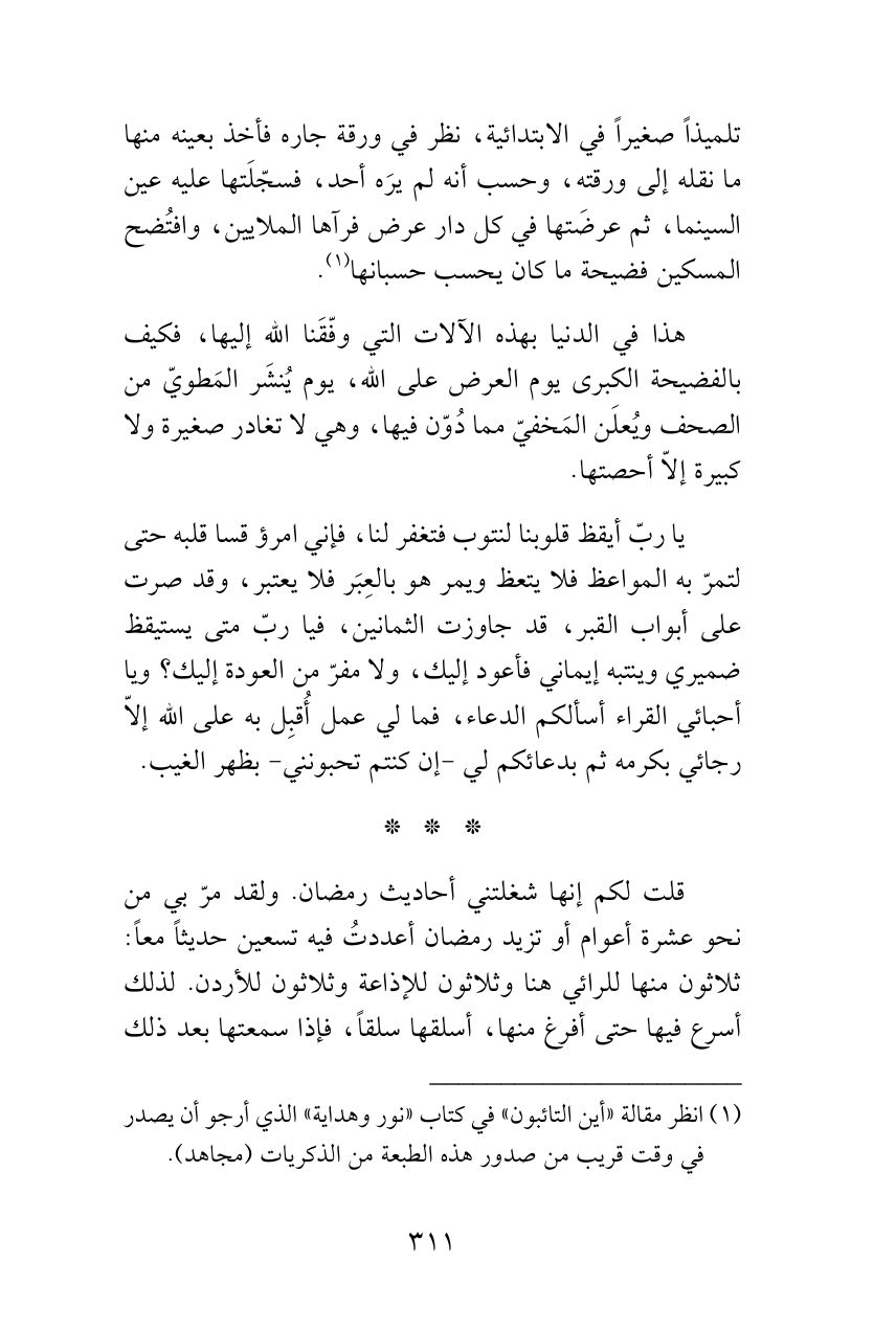 يا ربّ أيقظ قلوبنا لنتوب فتغفر لنا، فإني امرؤ قسا قلبه حتى لتمرّ به المواعظ فلا يتعظ ويمر هو بالعِبَر فلا يعتبر، وقد صرت على أبواب القبر، قد جاوزت الثمانين، فيا ربّ متى يستيقظ ضميري وينتبه إيماني فأعود إليك، ولا مفرّ من العودة إليك؟ ويا أحبائي القراء أسألكم الدعاء، فما لي عمل أُقبِل به على الله إلاّ رجائي بكرمه ثم بدعائكم لي -إن كنتم تحبونني- بظهر الغيب.