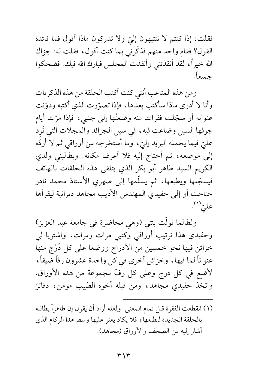ومن هذه المتاعب أنني كنت أكتب الحلقة من هذه الذكريات وأنا لا أدري ماذا سأكتب بعدها، فإذا تصوّرت الذي أكتبه ودوّنت عنوانه أو سجّلت فقرات منه وضعتُها إلى جنبي، فإذا مرّت أيام جرفها السيل وضاعت فيه، في سيل الجرائد والمجلات التي تَرِد عليّ فيما يحمله البريد إليّ، وما أستخرجه من أوراقي ثم لا أردّه إلى موضعه، ثم أحتاج إليه فلا أعرف مكانه. ويطالبني ولدي الكريم السيد طاهر أبو بكر الذي يتلقى هذه الحلقات بالهاتف فيسجّلها ويطبعها، ثم يسلّمها إلى صهري الأستاذ محمد نادر حتاحت أو إلى حفيدي المهندس الأديب مجاهد ديرانية ليقرأها عليّ (¬1).
