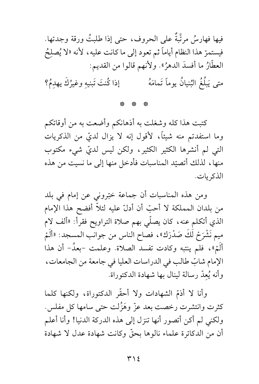ومن هذه المناسبات أن جماعة خبّروني عن إمام في بلد من بلدان المملكة لا أحبّ أن أدلّ عليه لئلاّ أفضح هذا الإمام الذي أتكلم عنه، كان يصلّي بهم صلاة التراويح فقرأ: «ألف لام ميم نَشْرَحْ لَكَ صَدْرَك»، فصاح الناس من جوانب المسجد: «ألَمْ ألَمْ»، فلم ينتبه وكادت تفسد الصلاة. وعلمت -بعدُ- أن هذا الإمام شابّ طالب في الدراسات العليا في جامعة من الجامعات، وأنه يُعِدّ رسالة لينال بها شهادة الدكتوراة.