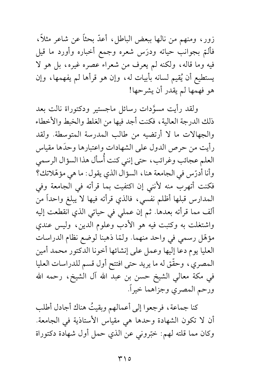 ولقد رأيت مسوَّدات رسائل ماجستير ودكتوراة نالت بعد ذلك الدرجة العالية، فكنت أجد فيها من الغلط والخبط والأخطاء والجهالات ما لا أرتضيه من طالب المدرسة المتوسطة. ولقد رأيت من حرص الدول على الشهادات واعتبارها وحدَها مقياس العلم عجائب وغرائب، حتى إنني كنت أُسأل هذا السؤال الرسمي وأنا أدرّس في الجامعة هنا، السؤال الذي يقول: ما هي مؤهّلاتك؟ فكنت أتهرب منه لأنني إن اكتفيت بما قرأته في الجامعة وفي المدارس قبلها أظلم نفسي، فالذي قرأته فيها لا يبلغ واحداً من ألف مما قرأته بعدها. ثم إن عملي في حياتي الذي انقطعت إليه واشتغلت به وكتبت فيه هو الأدب وعلوم الدين، وليس عندي مؤهّل رسمي في واحد منهما. ولمّا ذهبنا لوضع نظام الدراسات العليا يوم دعا إليها وعمل على إنشائها أخونا الدكتور محمد أمين المصري، وحقّق له ما يريد حتى افتتح أول قسم للدراسات العليا في مكة معالي الشيخ حسن بن عبد الله آل الشيخ، رحمه الله ورحم المصري وجزاهما خيراً.