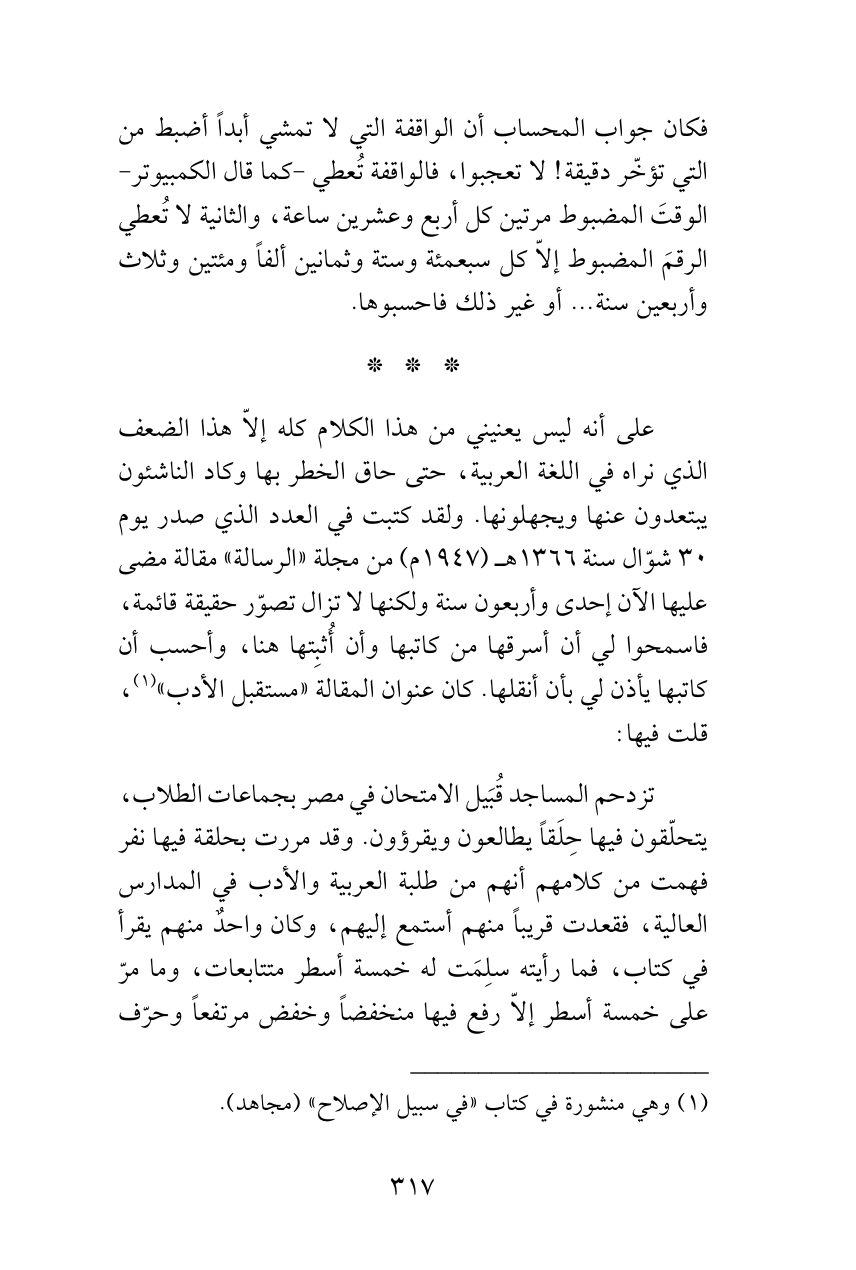 على أنه ليس يعنيني من هذا الكلام كله إلاّ هذا الضعف الذي نراه في اللغة العربية، حتى حاق الخطر بها وكاد الناشئون يبتعدون عنها ويجهلونها. ولقد كتبت في العدد الذي صدر يوم 30 شوّال سنة 1366هـ (1947م) من مجلة «الرسالة» مقالة مضى عليها الآن إحدى وأربعون سنة ولكنها لا تزال تصوّر حقيقة قائمة، فاسمحوا لي أن أسرقها من كاتبها وأن أُثبِتها هنا، وأحسب أن كاتبها يأذن لي بأن أنقلها. كان عنوان المقالة «مستقبل الأدب» (¬1)، قلت فيها: