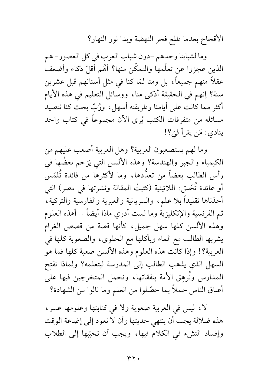 وما لشبابنا وحدهم -دون شباب العرب في كل العصور- هم الذين عجزوا عن تعلّمها والتمكّن منها؟ أهُم أقلّ ذكاء وأضعف عقلاً منهم جميعاً، بل ومنا لمّا كنا في مثل أسنانهم قبل عشرين سنة؟ إنهم في الحقيقة أذكى منا، ووسائل التعليم في هذه الأيام أكثر مما كانت على أيامنا وطريقته أسهل، ورُبّ بحث كنا نتصيد مسائله من متفرقات الكتب يُرى الآن مجموعاً في كتاب واحد ينادي: مَن يقرأ فيّ؟!