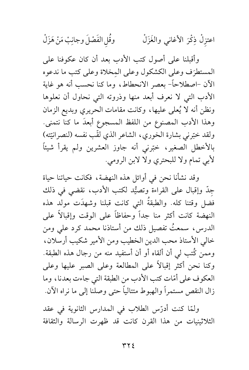 وأقبلنا على أصول كتب الأدب بعد أن كان عكوفنا على المستطرَف وعلى الكشكول وعلى المِخلاة وعلى كتب ما ندعوه الآن -اصطلاحاً- بعصر الانحطاط، وما كنا نحسب أنه هو غاية الأدب التي لا نعرف أبعد منها وذروته التي نحاول أن نعلوها ونظن أنه لا يُعلى عليها، وكانت مقامات الحريري وبديع الزمان وهذا الأدب المصنوع من اللفظ المسجوع أبعدَ ما كنا نتمنى. ولقد خبّرني بشارة الخوري، الشاعر الذي لقّب نفسه (لنصرانيّته) بالأخطل الصغير، خبّرني أنه جاوز العشرين ولم يقرأ شيئاً لأبيتمام ولا للبحتري ولا لابن الرومي.