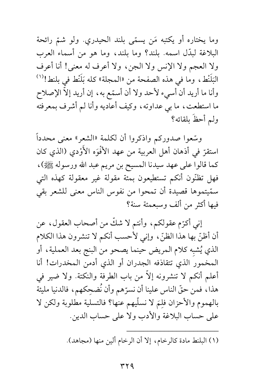 وما يختاره أو يكتبه مَن يسمّى بلند الحيدري. ولو شمّ رائحة البلاغة لبدّل اسمه. بلند؟ وما بلند، وما هو من أسماء العرب ولا العجم ولا الإنس ولا الجن، ولا أعرف له معنى! أنا أعرف البَلَنْط، وما في هذه الصفحة من «المجلة» كله بَلَنْط في بلنط! (¬1) وأنا ما أريد أن أسيء لأحد ولا أن أسمّع به، إن أريد إلاّ الإصلاح ما استطعت، ما بي عداوته، وكيف أعاديه وأنا لم أشرف بمعرفته ولم أحظَ بلقائه؟