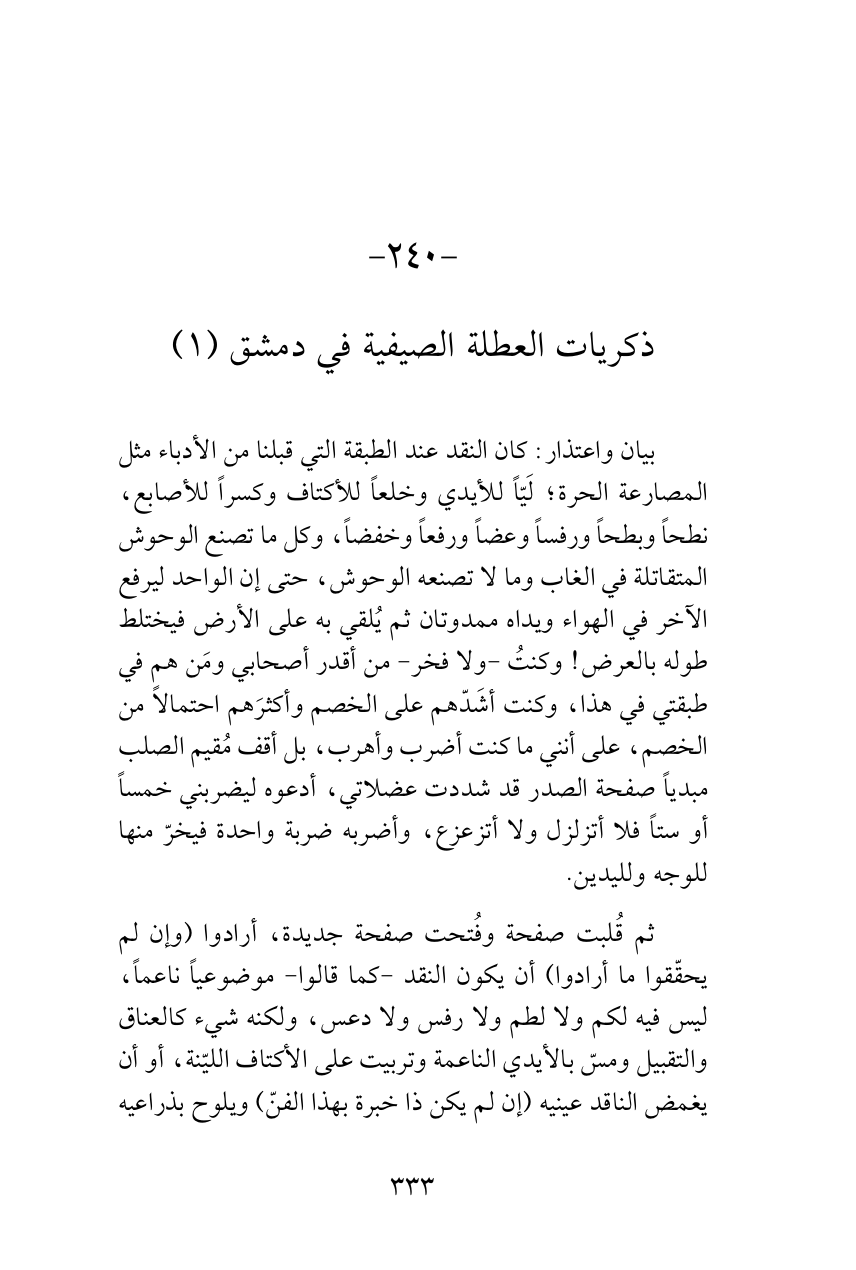بيان واعتذار: كان النقد عند الطبقة التي قبلنا من الأدباء مثل المصارعة الحرة؛ لَيّاً للأيدي وخلعاً للأكتاف وكسراً للأصابع، نطحاً وبطحاً ورفساً وعضاً ورفعاً وخفضاً، وكل ما تصنع الوحوش المتقاتلة في الغاب وما لا تصنعه الوحوش، حتى إن الواحد ليرفع الآخر في الهواء ويداه ممدوتان ثم يُلقي به على الأرض فيختلط طوله بالعرض! وكنتُ -ولا فخر- من أقدر أصحابي ومَن هم في طبقتي في هذا، وكنت أشَدّهم على الخصم وأكثرَهم احتمالاً من الخصم، على أنني ما كنت أضرب وأهرب، بل أقف مُقيم الصلب مبدياً صفحة الصدر قد شددت عضلاتي، أدعوه ليضربني خمساً أو ستاً فلا أتزلزل ولا أتزعزع، وأضربه ضربة واحدة فيخرّ منها للوجه ولليدين.