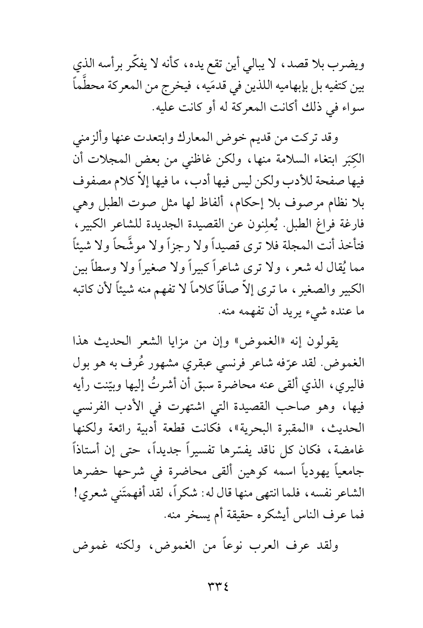 يقولون إنه «الغموض» وإن من مزايا الشعر الحديث هذا الغموض. لقد عرّفه شاعر فرنسي عبقري مشهور عُرف به هو بول فاليري، الذي ألقى عنه محاضرة سبق أن أشرتُ إليها وبيّنت رأيه فيها، وهو صاحب القصيدة التي اشتهرت في الأدب الفرنسي الحديث، «المقبرة البحرية»، فكانت قطعة أدبية رائعة ولكنها غامضة، فكان كل ناقد يفسّرها تفسيراً جديداً، حتى إن أستاذاً جامعياً يهودياً اسمه كوهين ألقى محاضرة في شرحها حضرها الشاعر نفسه، فلما انتهى منها قال له: شكراً، لقد أفهمتَني شعري! فما عرف الناس أيشكره حقيقة أم يسخر منه.