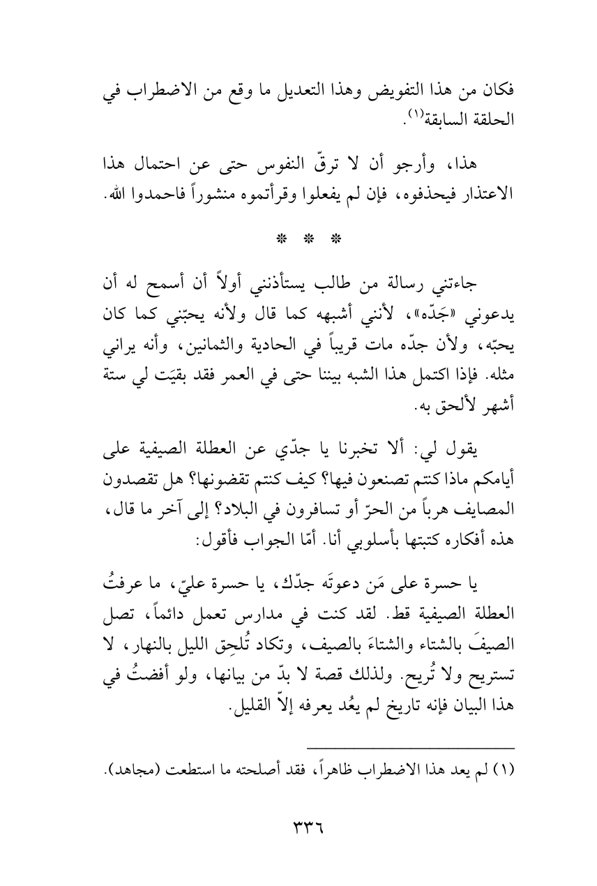 يا حسرة على مَن دعوتَه جدّك، ياحسرة عليّ، ما عرفتُ العطلة الصيفية قط. لقد كنت في مدارس تعمل دائماً، تصل الصيفَ بالشتاء والشتاءَ بالصيف، وتكاد تُلحِق الليل بالنهار، لا تستريح ولا تُريح. ولذلك قصة لا بدّ من بيانها، ولو أفضتُ في هذا البيان فإنه تاريخ لم يعُد يعرفه إلاّ القليل.