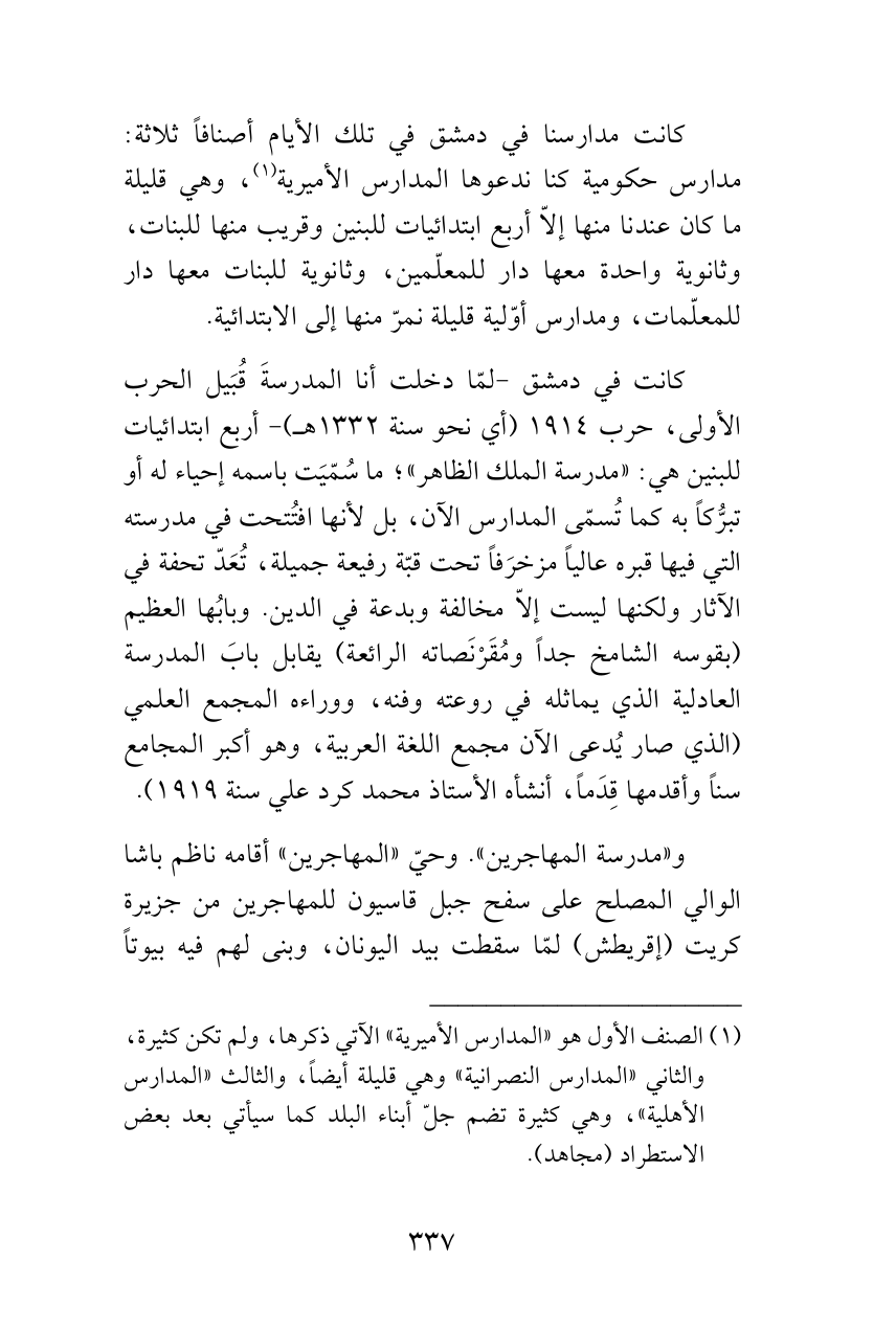 كانت مدارسنا في دمشق في تلك الأيام أصنافاً ثلاثة: مدارس حكومية كنا ندعوها المدارس الأميرية (¬1)، وهي قليلة ما كان عندنا منها إلاّ أربع ابتدائيات للبنين وقريب منها للبنات، وثانوية واحدة معها دار للمعلّمين، وثانوية للبنات معها دار للمعلّمات، ومدارس أوّلية قليلة نمرّ منها إلى الابتدائية.