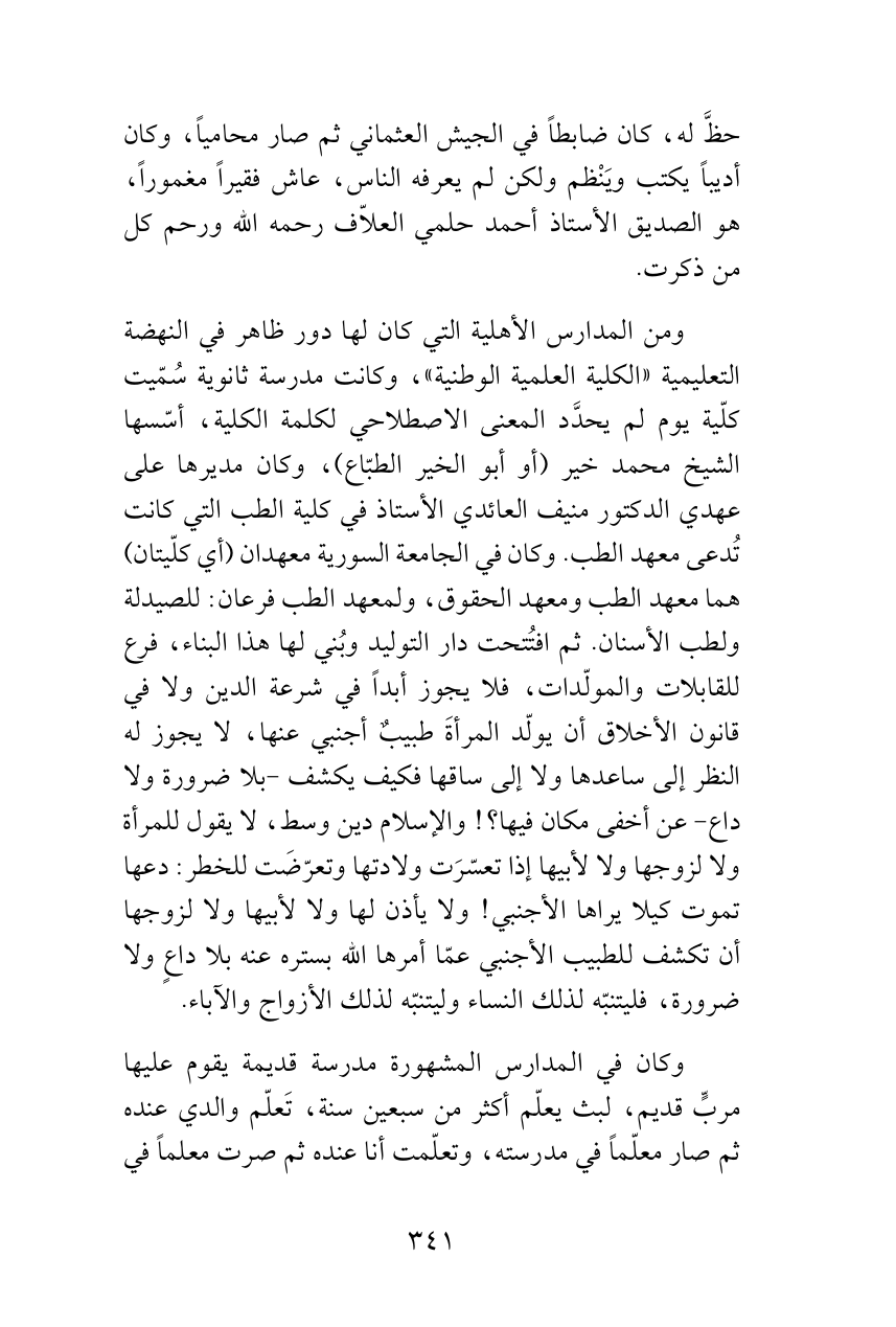 ومن المدارس الأهلية التي كان لها دور ظاهر في النهضة التعليمية «الكلية العلمية الوطنية»، وكانت مدرسة ثانوية سُمّيت كلّية يوم لم يحدَّد المعنى الاصطلاحي لكلمة الكلية، أسّسها الشيخ محمد خير (أو أبو الخير الطبّاع)، وكان مديرها على عهدي الدكتور منيف العائدي الأستاذ في كلية الطب التي كانت تُدعى معهد الطب. وكان في الجامعة السورية معهدان (أي كلّيتان) هما معهد الطب ومعهد الحقوق، ولمعهد الطب فرعان: للصيدلة ولطب الأسنان. ثم افتُتحت دار التوليد وبُني لها هذا البناء، فرع للقابلات والمولّدات، فلا يجوز أبداً في شرعة الدين ولا في قانون الأخلاق أن يولّد المرأةَ طبيبٌ أجنبي عنها، لا يجوز له النظر إلى ساعدها ولا إلى ساقها فكيف يكشف -بلا ضرورة ولا داع- عن أخفى مكان فيها؟! والإسلام دين وسط، لا يقول للمرأة ولا لزوجها ولا لأبيها إذا تعسّرَت ولادتها وتعرّضَت للخطر: دعها تموت كيلا يراها الأجنبي! ولا يأذن لها ولا لأبيها ولا لزوجها أن تكشف للطبيب الأجنبي عمّا أمرها الله بستره عنه بلا داعٍ ولا ضرورة، فليتنبّه لذلك النساء وليتنبّه لذلك الأزواج والآباء.