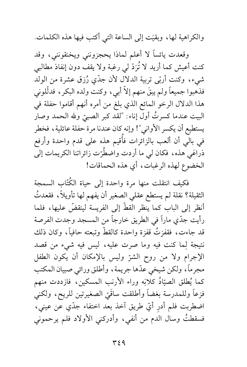وقعدت يائساً لا أعلم لماذا يحجزونني ويخنقونني، وقد كنت أعيش كما أريد لا تُرَدّ لي رغبة ولا يقف دون إنفاذ مطالبي شيء، وكنت أربّى تربية الدلال لأن جدّي رُزق عشرة من الولد فذهبوا جميعاً ولم يبقَ منهم إلاّ أبي، وكنت ولده البكر، فدلّلوني هذا الدلال الرخو المائع الذي بلغ من أمره أنهم أقاموا حفلة في البيت عندما كسرتُ أول إناء: "لقد كبر الصبيّ ولله الحمد وصار يستطيع أن يكسر الأواني"! وإنه كان عندنا مرة حفلة عائلية، فخطر في بالي أن ألعب بالزائرات فأُقيم هذه على قدم واحدة وأرفع ذراعَي هذه، فكان لي ما أردت واضطُرّت زائراتنا الكريمات إلى الخضوع لهذه الرغبات، أي هذه الحماقات!