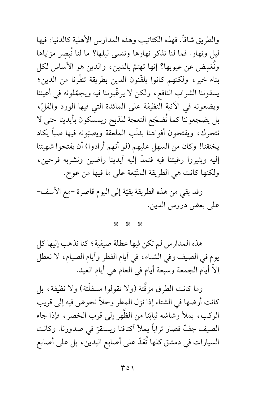 والطريق شاقاً. فهذه الكتاتيب وهذه المدارس الأهلية كالدنيا: فيها ليل ونهار. فما لنا نذكر نهارها وننسى ليلها؟ ما لنا نُبصِر مزاياها ونُغمِض عن عيوبها؟ إنها تهتمّ بالدين، والدين هو الأساس لكل بناء خير، ولكنهم كانوا يلقّنون الدين بطريقة تنفّرنا من الدين؛ يسقوننا الشراب النافع، ولكن لا يرغّبوننا فيه ويجمّلونه في أعيننا ويضعونه في الآنية النظيفة على المائدة التي فيها الورد والفلّ، بل يضجعوننا كما تُضجَع النعجة للذبح ويمسكون بأيدينا حتى لا نتحرك، ويفتحون أفواهنا بذنَب الملعقة ويصبّونه فيها صباً يكاد يخنقنا! وكان من السهل عليهم (لو أنهم أرادوا) أن يفتحوا شهيتنا إليه ويثيروا رغبتنا فيه فنمدّ إليه أيدينا راضين ونشربه فرحين، ولكنها كانت هي الطريقة المتّبَعة على ما فيها من عوج.