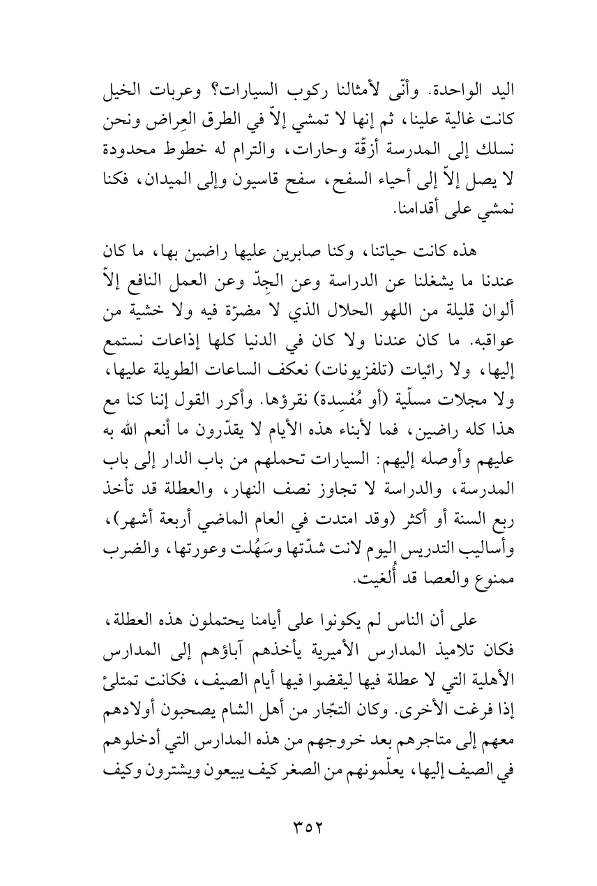 هذه كانت حياتنا، وكنا صابرين عليها راضين بها، ما كان عندنا ما يشغلنا عن الدراسة وعن الجِدّ وعن العمل النافع إلاّ ألوان قليلة من اللهو الحلال الذي لا مضرّة فيه ولا خشية من عواقبه. ما كان عندنا ولا كان في الدنيا كلها إذاعات نستمع إليها، ولا رائيات (تلفزيونات) نعكف الساعات الطويلة عليها، ولا مجلات مسلّية (أو مُفسِدة) نقرؤها. وأكرر القول إننا كنا مع هذا كله راضين، فما لأبناء هذه الأيام لا يقدّرون ما أنعم الله به عليهم وأوصله إليهم: السيارات تحملهم من باب الدار إلى باب المدرسة، والدراسة لا تجاوز نصف النهار، والعطلة قد تأخذ ربع السنة أو أكثر (وقد امتدت في العام الماضي أربعة أشهر)، وأساليب التدريس اليوم لانت شدّتها وسَهُلت وعورتها، والضرب ممنوع والعصا قد أُلغيت.