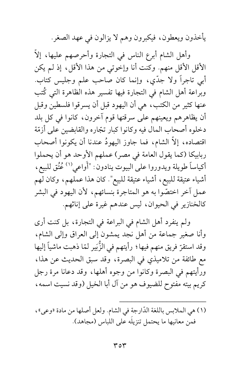 وأهل الشام أبرع الناس في التجارة وأحرصهم عليها، إلاّ الأقل الأقل منهم. وكنت أنا وإخوتي من هذا الأقل، إذ لم يكن أبي تاجراً ولا جدّي، وإنما كان صاحب علم وجليس كتاب. وبراعة أهل الشام في التجارة فيها تفسير هذه الظاهرة التي كُتب عنها كثير من الكتب، هي أن اليهود قبل أن يسرقوا فلسطين وقبل أن يظاهرهم ويعينهم على سرقتها قوم آخرون، كانوا في كل بلد دخلوه أصحاب المال فيه وكانوا كبار تجّاره والقابضين على أزمّة اقتصاده، إلاّ الشام، فما جاوز اليهودُ عندنا أن يكونوا أصحاب ربابيكا (كما يقول العامة في مصر) عملهم الأوحد هو أن يحملوا أكياساً طويلة ويدوروا على البيوت ينادون: "أَواعي (¬1) عُتُق للبيع، أشياء عتيقة للبيع، أشياء عتيقة للبيع". كان هذا عملهم، وكان لهم عمل آخر اختصّوا به هو المتاجرة بنسائهم، لأن اليهود في البشر كالخنازير في الحيوان، ليس عندهم غيرة على إناثهم.