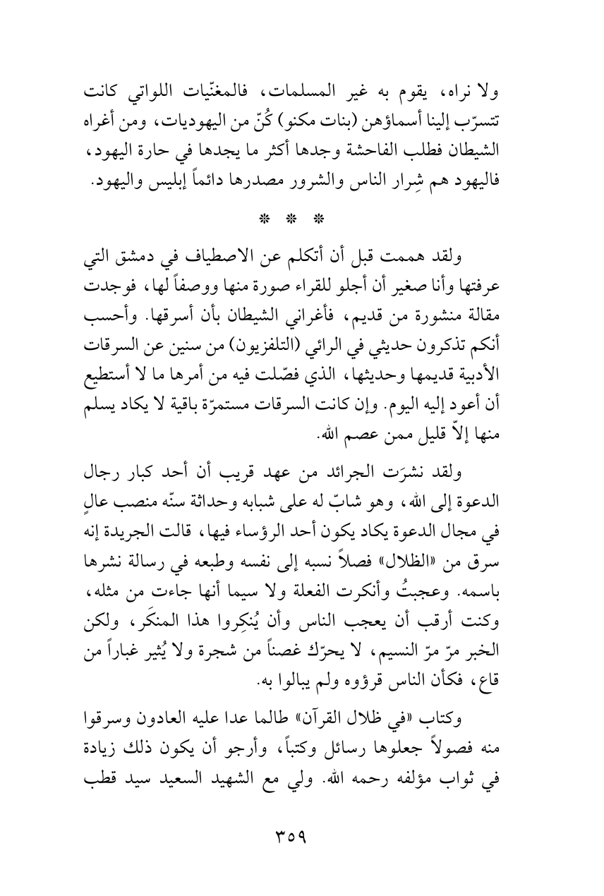 وكتاب «في ظلال القرآن» طالما عدا عليه العادون وسرقوا منه فصولاً جعلوها رسائل وكتباً، وأرجو أن يكون ذلك زيادة في ثواب مؤلفه رحمه الله. ولي مع الشهيد السعيد سيد قطب