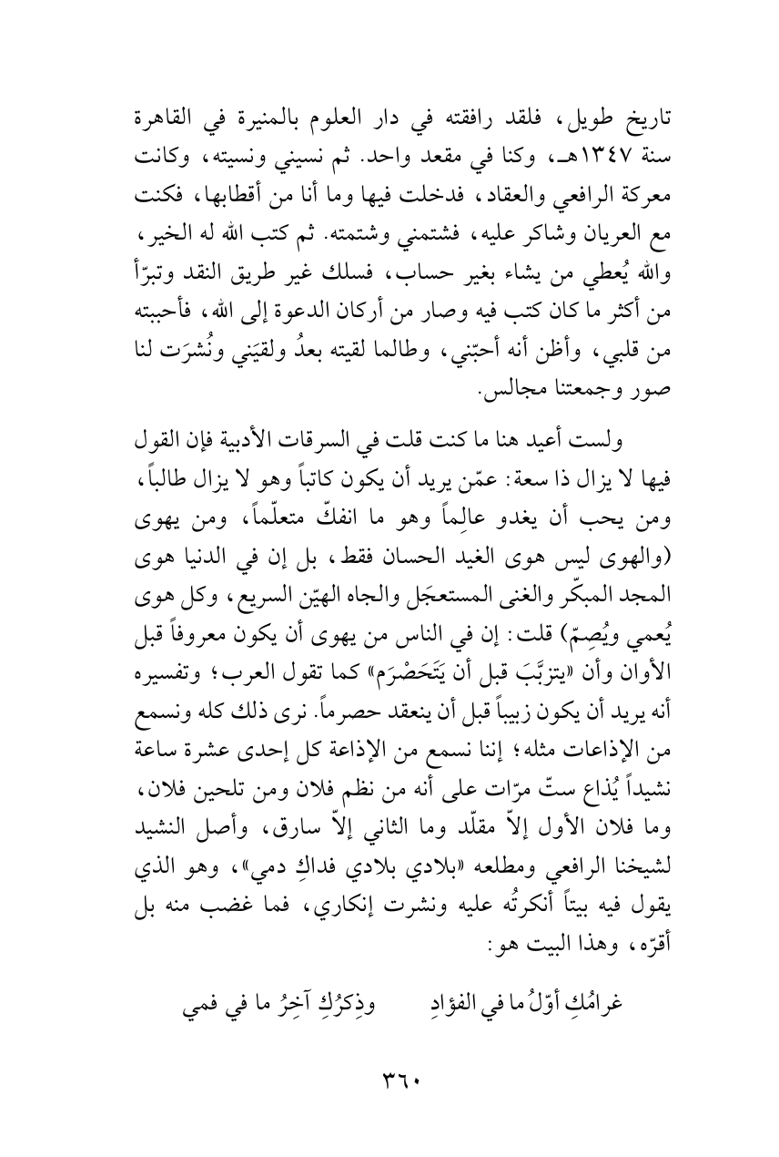 تاريخ طويل، فلقد رافقته في دار العلوم بالمنيرة في القاهرة سنة 1347هـ، وكنا في مقعد واحد. ثم نسيني ونسيته، وكانت معركة الرافعي والعقاد، فدخلت فيها وما أنا من أقطابها، فكنت مع العريان وشاكر عليه، فشتمني وشتمته. ثم كتب الله له الخير، والله يُعطي من يشاء بغير حساب، فسلك غير طريق النقد وتبرّأ من أكثر ما كان كتب فيه وصار من أركان الدعوة إلى الله، فأحببته من قلبي، وأظن أنه أحبّني، وطالما لقيته بعدُ ولقيَني ونُشرَت لنا صور وجمعتنا مجالس.