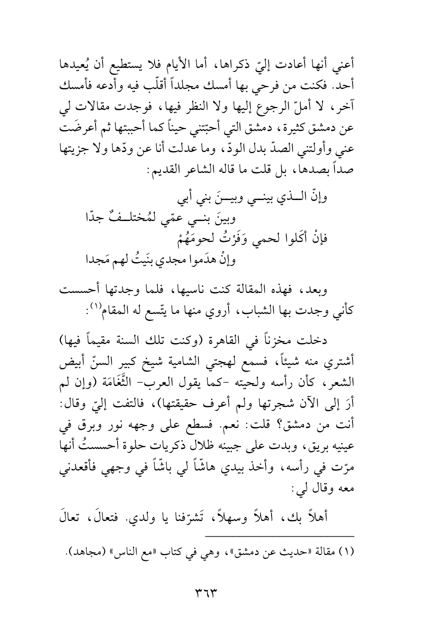 أعني أنها أعادت إليّ ذكراها، أما الأيام فلا يستطيع أن يُعيدها أحد. فكنت من فرحي بها أمسك مجلداً أقلّب فيه وأدعه فأمسك آخر، لا أملّ الرجوع إليها ولا النظر فيها، فوجدت مقالات لي عن دمشق كثيرة، دمشق التي أحبّتني حيناً كما أحببتها ثم أعرضَت عني وأولتني الصدّ بدل الودّ، وما عدلت أنا عن ودّها ولا جزيتها صداً بصدها، بل قلت ما قاله الشاعر القديم: