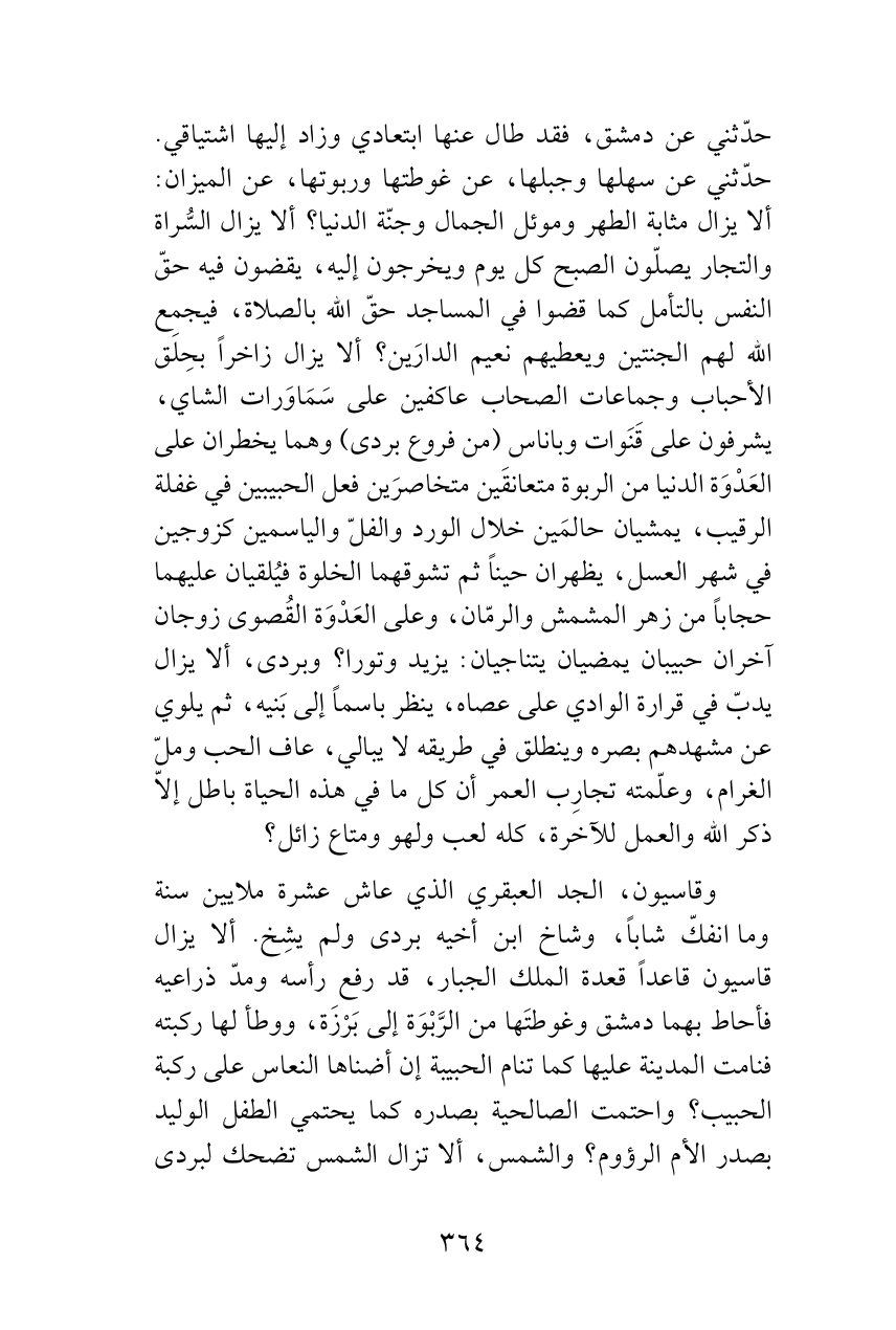 حدّثني عن دمشق، فقد طال عنها ابتعادي وزاد إليها اشتياقي. حدّثني عن سهلها وجبلها، عن غوطتها وربوتها، عن الميزان: ألا يزال مثابة الطهر وموئل الجمال وجنّة الدنيا؟ ألا يزال السُّراة والتجار يصلّون الصبح كل يوم ويخرجون إليه، يقضون فيه حقّ النفس بالتأمل كما قضوا في المساجد حقّ الله بالصلاة، فيجمع الله لهم الجنتين ويعطيهم نعيم الدارَين؟ ألا يزال زاخراً بحِلَق الأحباب وجماعات الصحاب عاكفين على سَمَاوَرات الشاي، يشرفون على قَنَوات وباناس (من فروع بردى) وهما يخطران على العَدْوَة الدنيا من الربوة متعانقَين متخاصرَين فعل الحبيبين في غفلة الرقيب، يمشيان حالمَين خلال الورد والفلّ والياسمين كزوجين في شهر العسل، يظهران حيناً ثم تشوقهما الخلوة فيُلقيان عليهما حجاباً من زهر المشمش والرمّان، وعلى العَدْوَة القُصوى زوجان آخران حبيبان يمضيان يتناجيان: يزيد وتورا؟ وبردى، ألا يزال يدبّ في قرارة الوادي على عصاه، ينظر باسماً إلى بَنيه، ثم يلوي عن مشهدهم بصره وينطلق في طريقه لا يبالي، عاف الحب وملّ الغرام، وعلّمته تجارِب العمر أن كل ما في هذه الحياة باطل إلاّ ذكر الله والعمل للآخرة، كله لعب ولهو ومتاع زائل؟