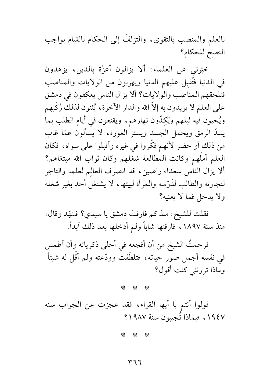 خبّرني عن العلماء: ألا يزالون أعزّة بالدين، يزهدون في الدنيا فتُقبِل عليهم الدنيا ويهربون من الولايات والمناصب فتلحقهم المناصب والولايات؟ ألا يزال الناس يعكفون في دمشق على العلم لا يريدون به إلاّ الله والدار الآخرة، يُثنون لذلك رُكَبهم ويُحيون فيه ليلهم ويَكِدّون نهارهم، ويقنعون في أيام الطلب بما يسدّ الرمق ويحمل الجسد ويستر العورة، لا يسألون عمّا غاب من ذلك أو حضر لأنهم فكّروا في غيره وأقبلوا على سواه، فكان العلم أملَهم وكانت المطالعة شغلهم وكان ثواب الله مبتغاهم؟ ألا يزال الناس سعداء راضين، قد انصرف العالِم لعلمه والتاجر لتجارته والطالب لدَرْسه والمرأة لبيتها، لا يشتغل أحد بغير شغله ولا يدخل فما لا يعنيه؟