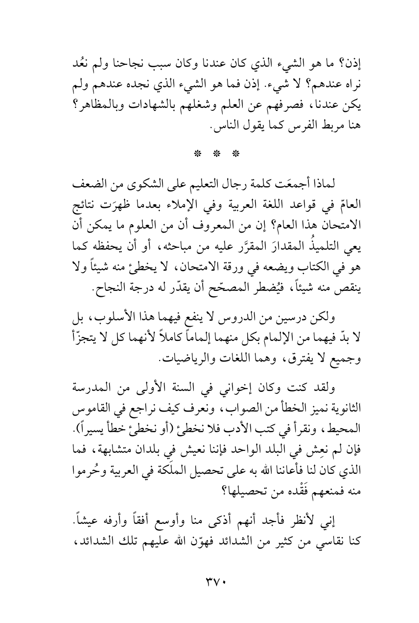 لماذا أجمعَت كلمة رجال التعليم على الشكوى من الضعف العامّ في قواعد اللغة العربية وفي الإملاء بعدما ظهرَت نتائج الامتحان هذا العام؟ إن من المعروف أن من العلوم ما يمكن أن يعي التلميذُ المقدارَ المقرَّر عليه من مباحثه، أو أن يحفظه كما هو في الكتاب ويضعه في ورقة الامتحان، لا يخطئ منه شيئاً ولا ينقص منه شيئاً، فيُضطر المصحّح أن يقدّر له درجة النجاح.