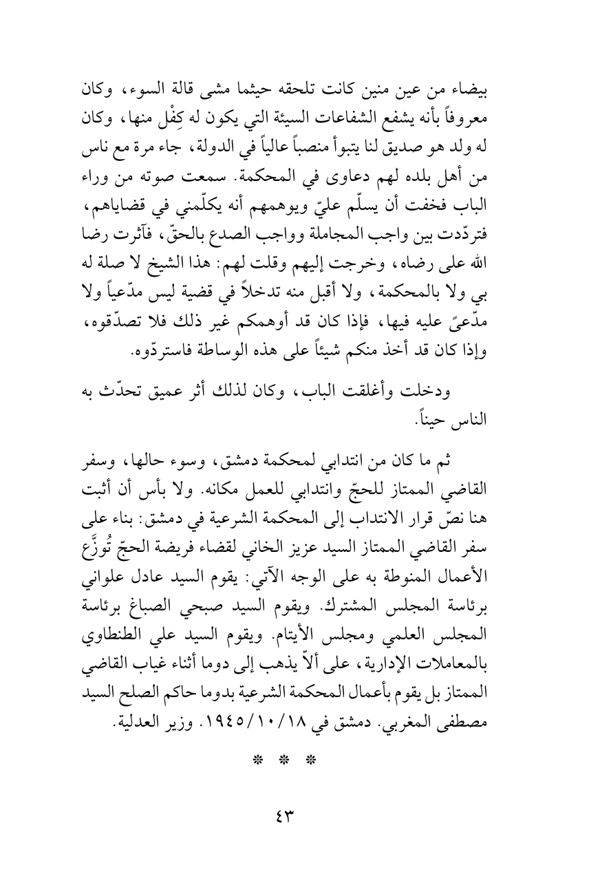 ثم ما كان من انتدابي لمحكمة دمشق، وسوء حالها، وسفر القاضي الممتاز للحجّ وانتدابي للعمل مكانه. ولا بأس أن أثبت هنا نصّ قرار الانتداب إلى المحكمة الشرعية في دمشق: بناء على سفر القاضي الممتاز السيد عزيز الخاني لقضاء فريضة الحجّ تُوزَّع الأعمال المنوطة به على الوجه الآتي: يقوم السيد عادل علواني برئاسة المجلس المشترك. ويقوم السيد صبحي الصباغ برئاسة المجلس العلمي ومجلس الأيتام. ويقوم السيد علي الطنطاوي بالمعاملات الإدارية، على ألاّ يذهب إلى دوما أثناء غياب القاضي الممتاز بل يقوم بأعمال المحكمة الشرعية بدوما حاكم الصلح السيد مصطفى المغربي. دمشق في 18/ 10/1945. وزير العدلية.