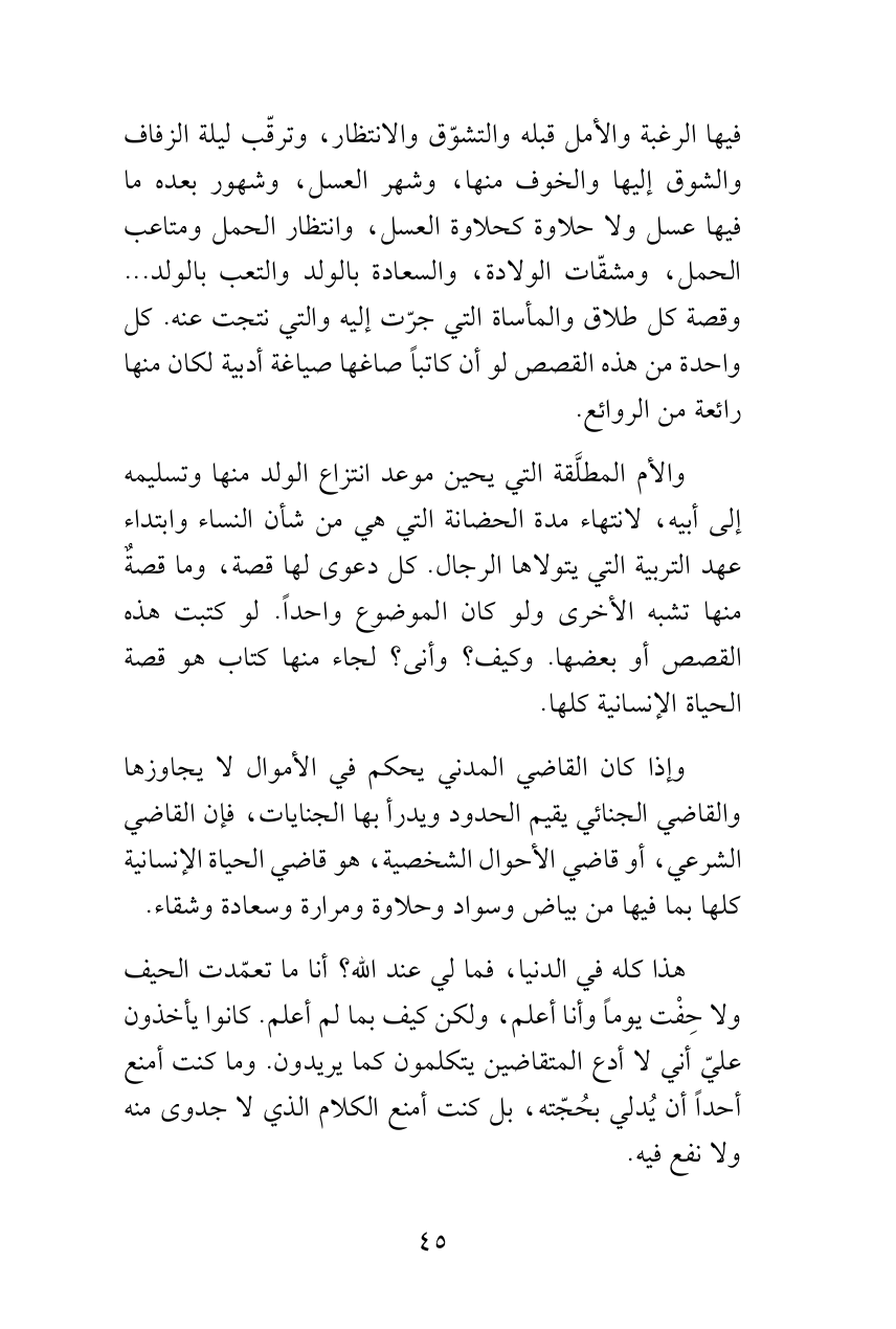 والأم المطلَّقة التي يحين موعد انتزاع الولد منها وتسليمه إلى أبيه، لانتهاء مدة الحضانة التي هي من شأن النساء وابتداء عهد التربية التي يتولاها الرجال. كل دعوى لها قصة، وما قصةٌ منها تشبه الأخرى ولو كان الموضوع واحداً. لو كتبت هذه القصص أو بعضها. وكيف؟ وأنى؟ لجاء منها كتاب هو قصة الحياة الإنسانية كلها.