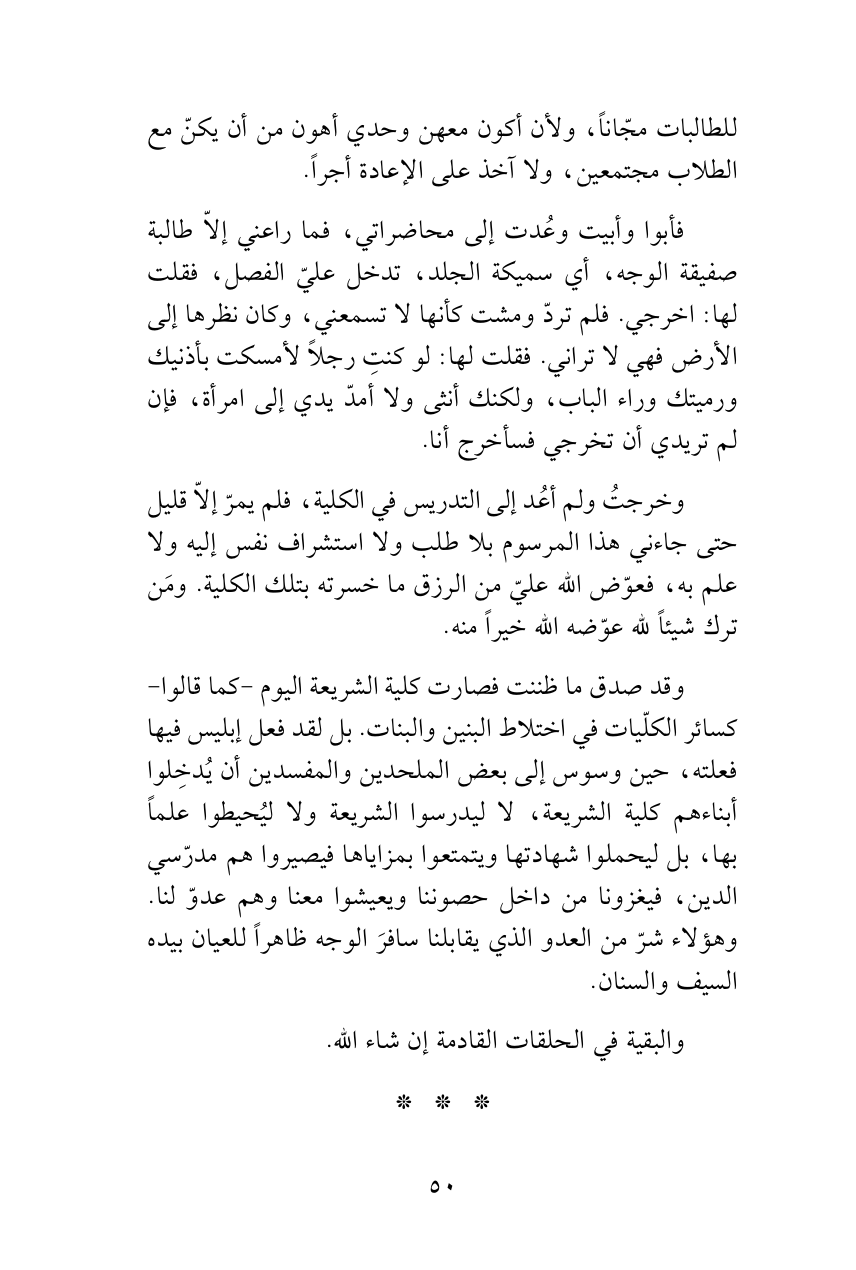 وقد صدق ما ظننت فصارت كلية الشريعة اليوم -كما قالوا- كسائر الكلّيات في اختلاط البنين والبنات. بل لقد فعل إبليس فيها فعلته، حين وسوس إلى بعض الملحدين والمفسدين أن يُدخِلوا أبناءهم كلية الشريعة، لا ليدرسوا الشريعة ولا ليُحيطوا علماً بها، بل ليحملوا شهادتها ويتمتعوا بمزاياها فيصيروا هم مدرّسي الدين، فيغزونا من داخل حصوننا ويعيشوا معنا وهم عدوّ لنا. وهؤلاء شرّ من العدو الذي يقابلنا سافرَ الوجه ظاهراً للعيان بيده السيف والسنان.