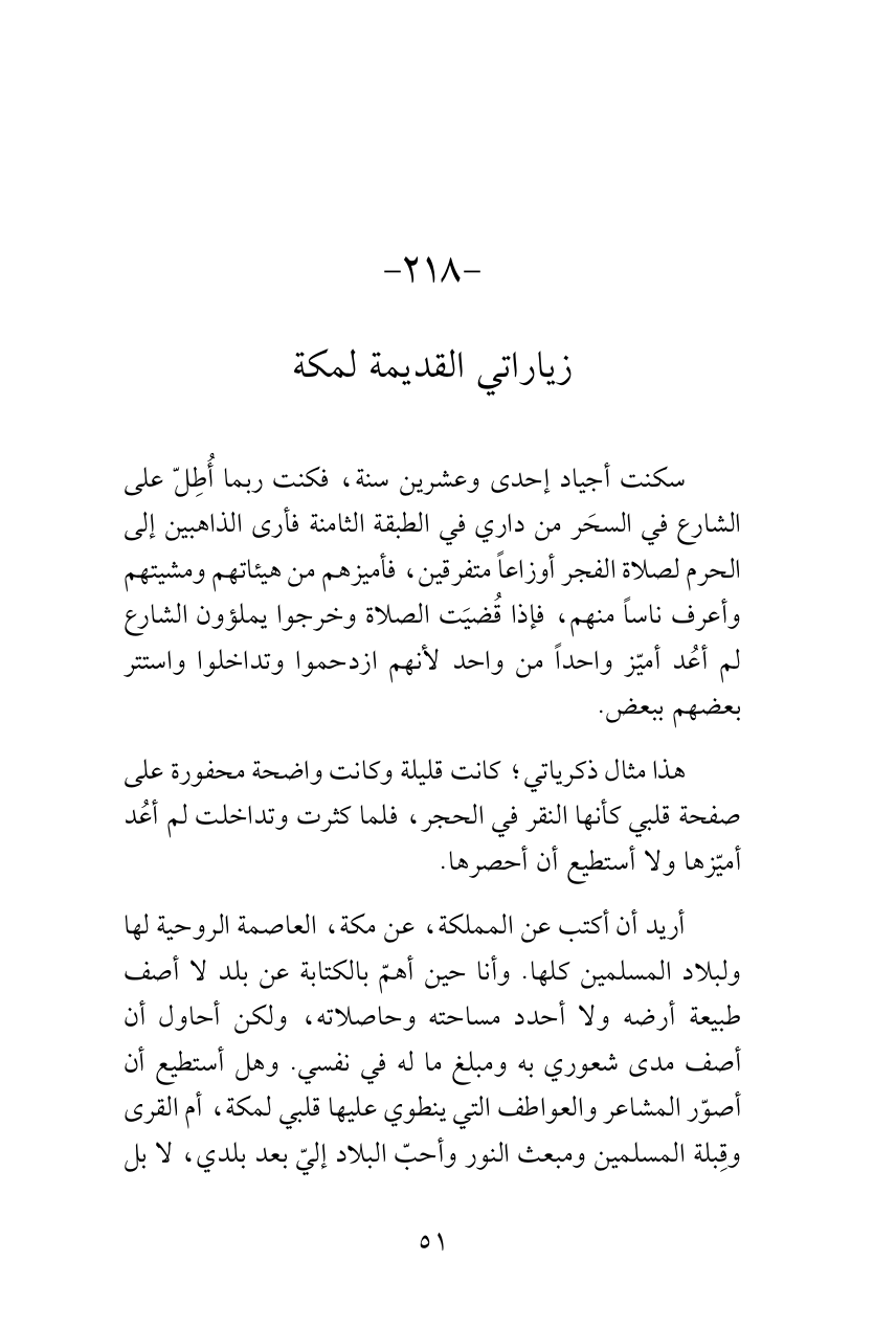 أريد أن أكتب عن المملكة، عن مكة، العاصمة الروحية لها ولبلاد المسلمين كلها. وأنا حين أهمّ بالكتابة عن بلد لا أصف طبيعة أرضه ولا أحدد مساحته وحاصلاته، ولكن أحاول أن أصف مدى شعوري به ومبلغ ما له في نفسي. وهل أستطيع أن أصوّر المشاعر والعواطف التي ينطوي عليها قلبي لمكة، أم القرى وقِبلة المسلمين ومبعث النور وأحبّ البلاد إليّ بعد بلدي، لا بل