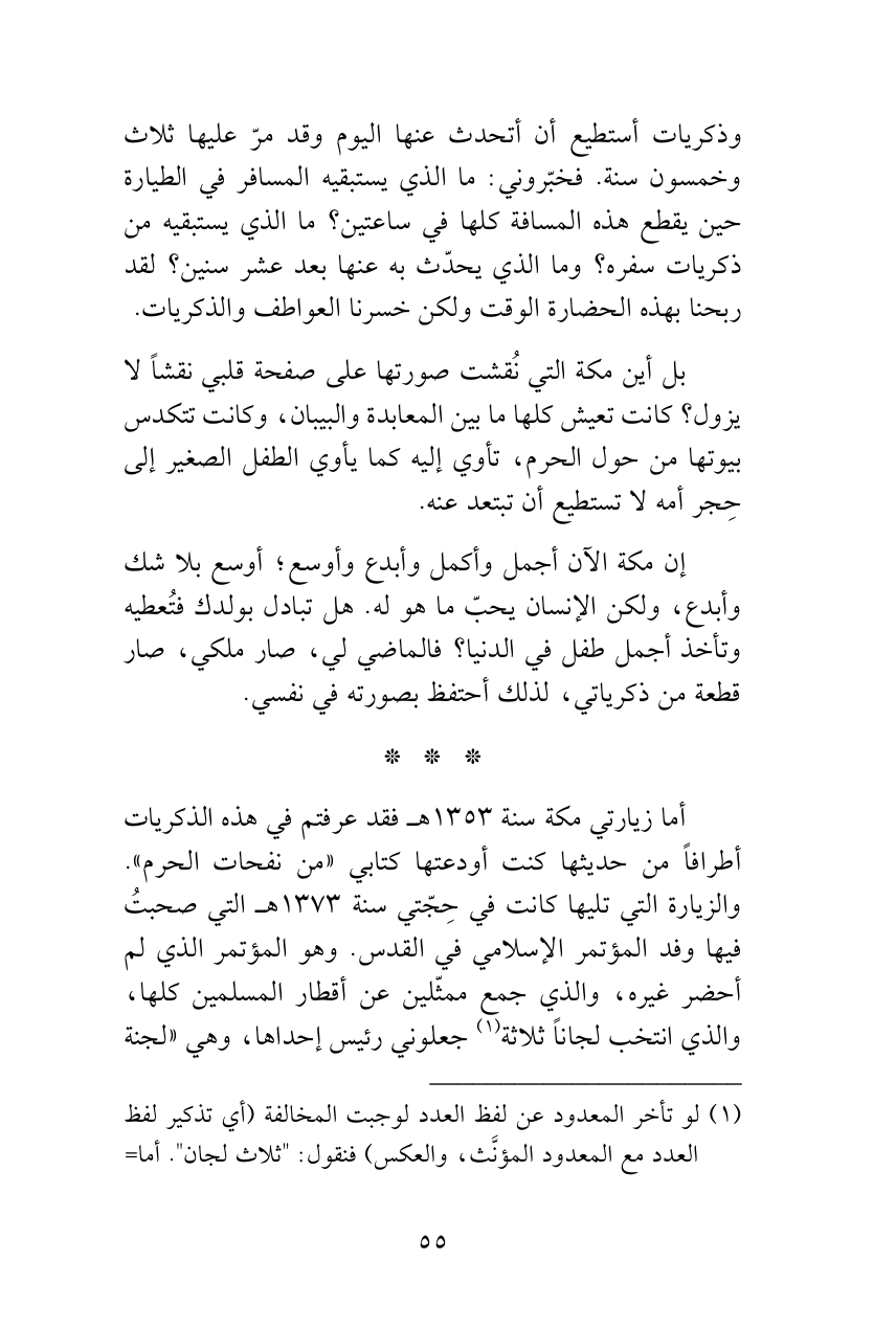 أما زيارتي مكة سنة 1353هـ فقد عرفتم في هذه الذكريات أطرافاً من حديثها كنت أودعتها كتابي «من نفحات الحرم». والزيارة التي تليها كانت في حِجّتي سنة 1373هـ التي صحبتُ فيها وفد المؤتمر الإسلامي في القدس. وهو المؤتمر الذي لم أحضر غيره، والذي جمع ممثّلين عن أقطار المسلمين كلها، والذي انتخب لجاناً ثلاثة (¬1) جعلوني رئيس إحداها، وهي «لجنة